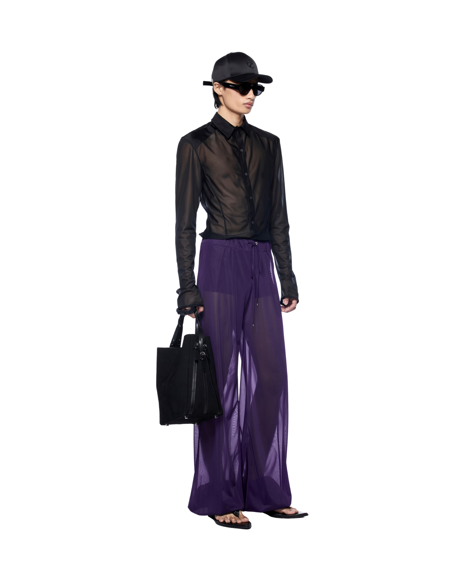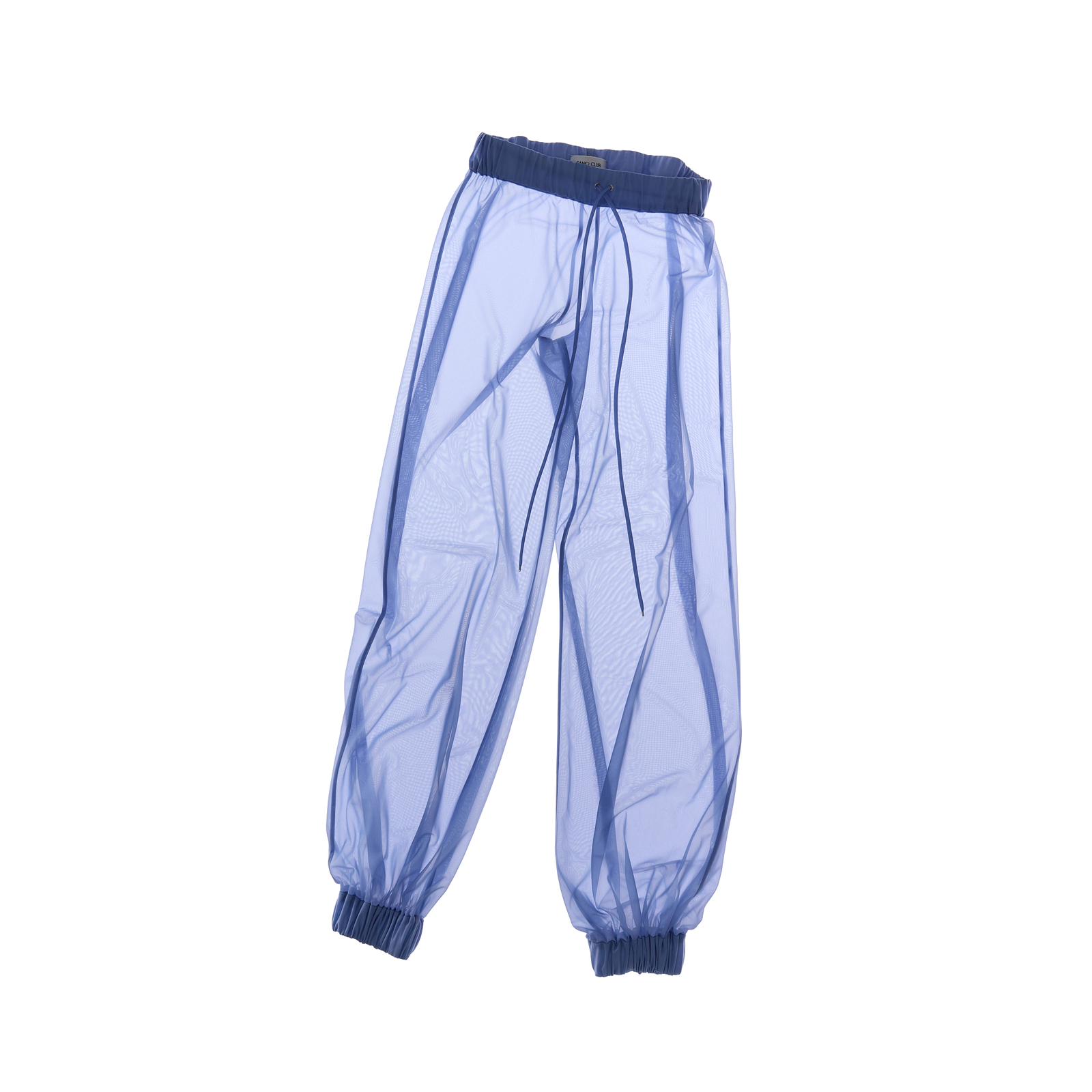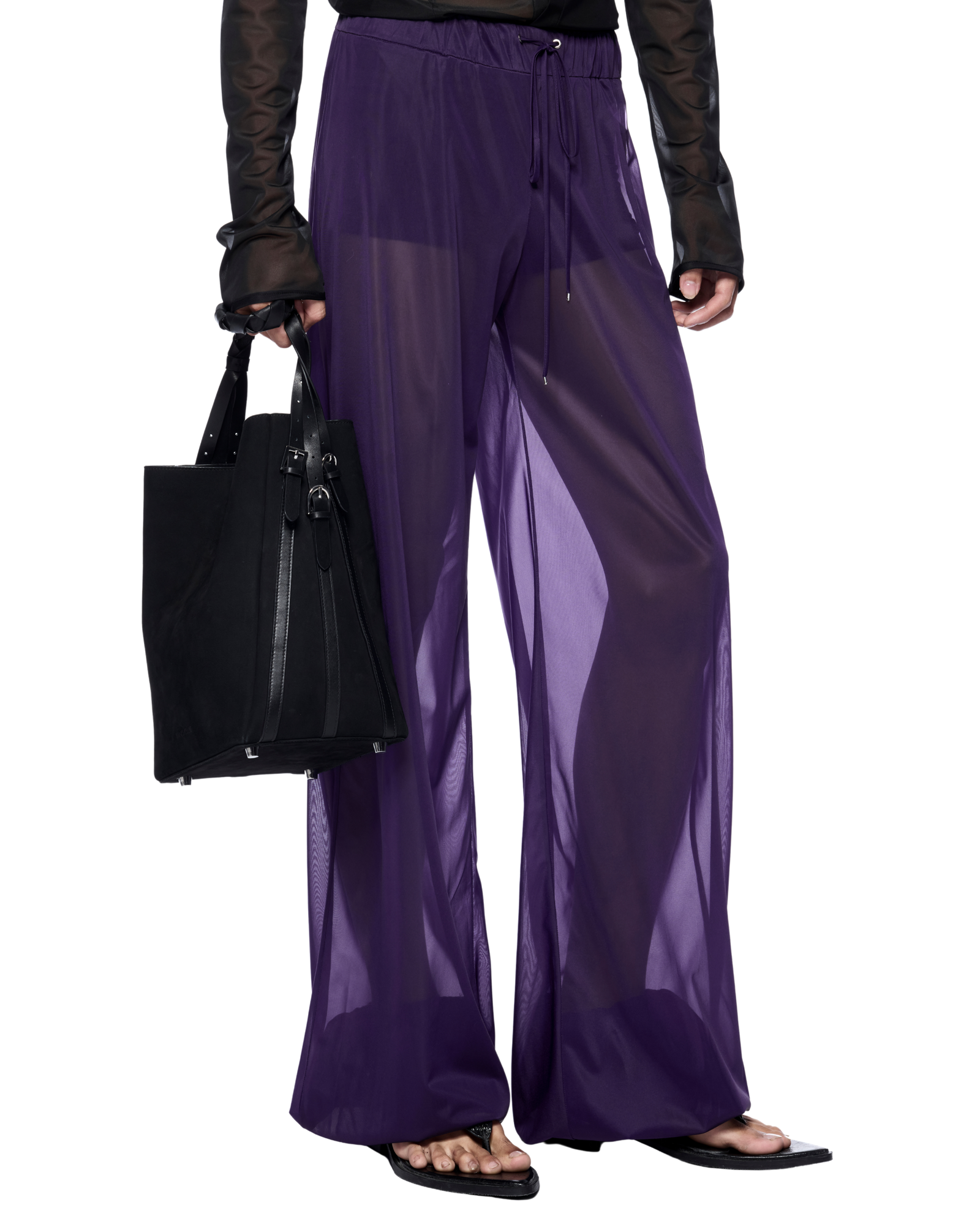 Sheer wide-leg sweatpants with an elastic drawstring waist and cuffed ankles for a modern, effortless fit. Pairs well with black or white bodysuits and statement glasses for a contemporary look.