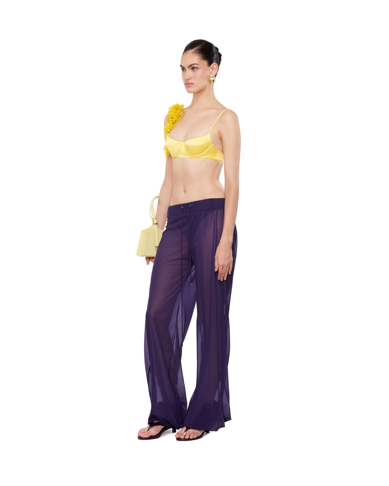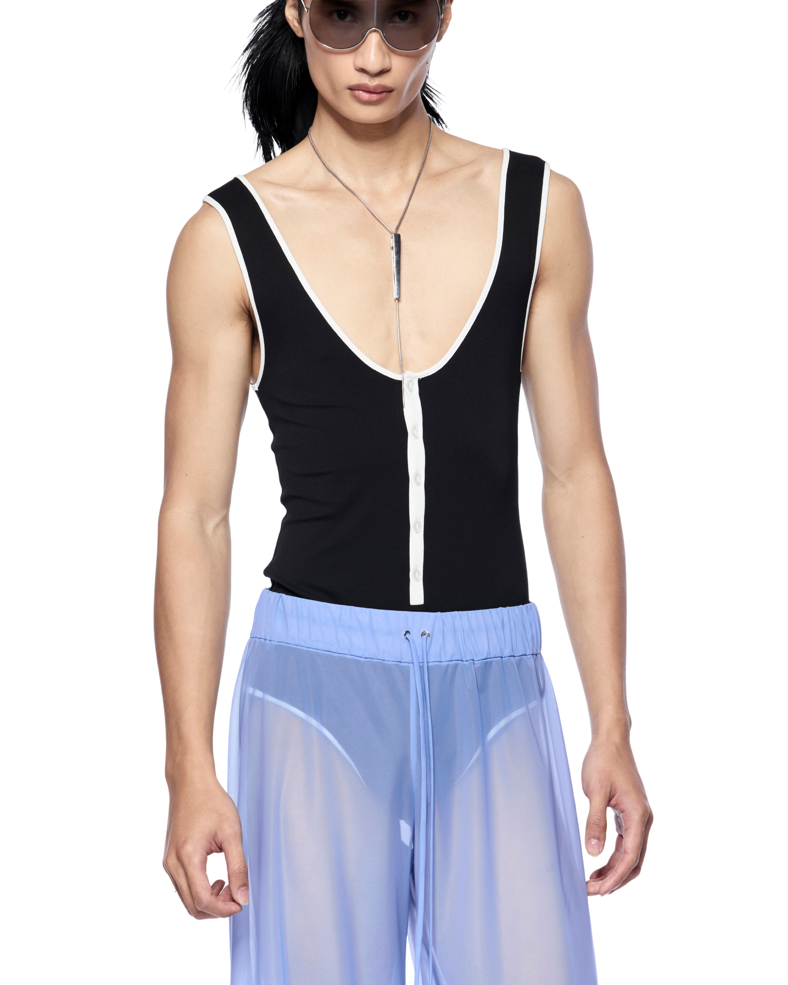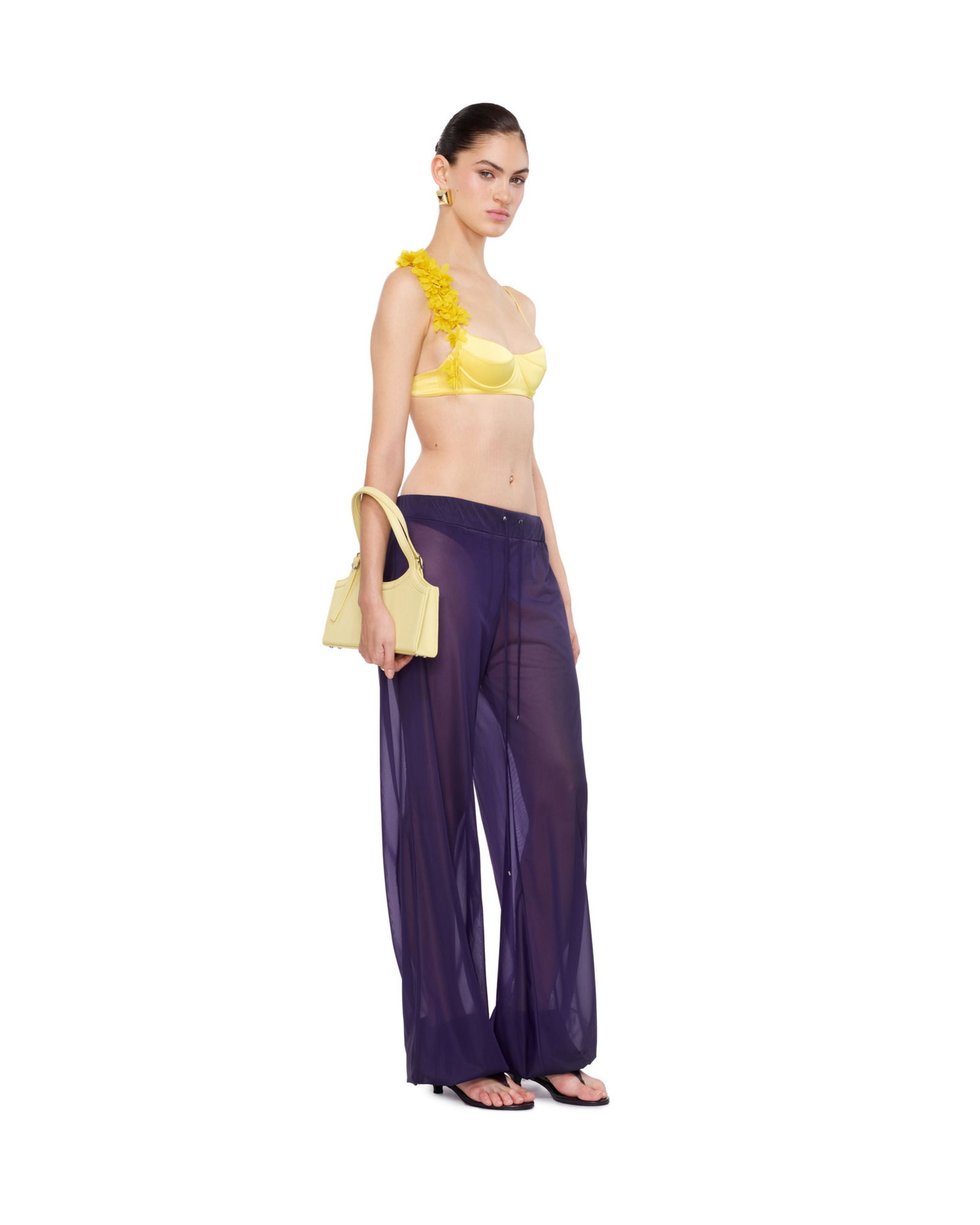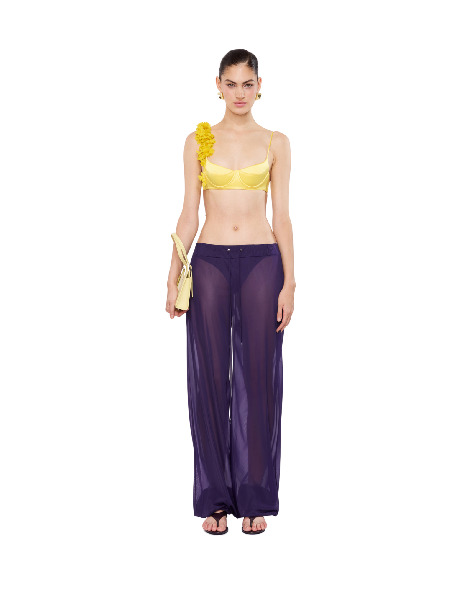 Sheer wide-leg sweatpants with an elastic drawstring waist and cuffed ankles for a modern, effortless fit. Pairs well with black or white bodysuits and statement glasses for a contemporary look.