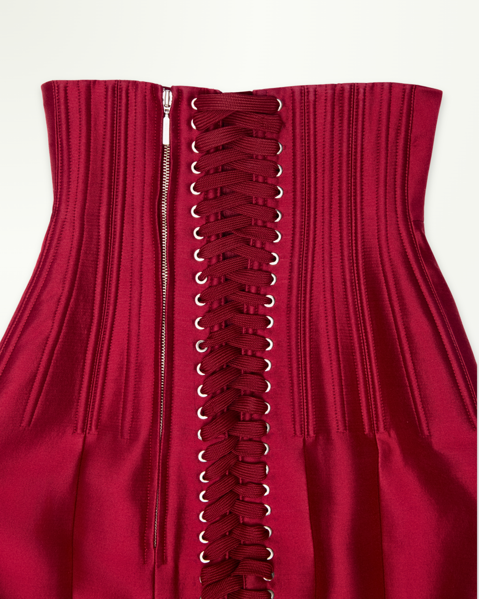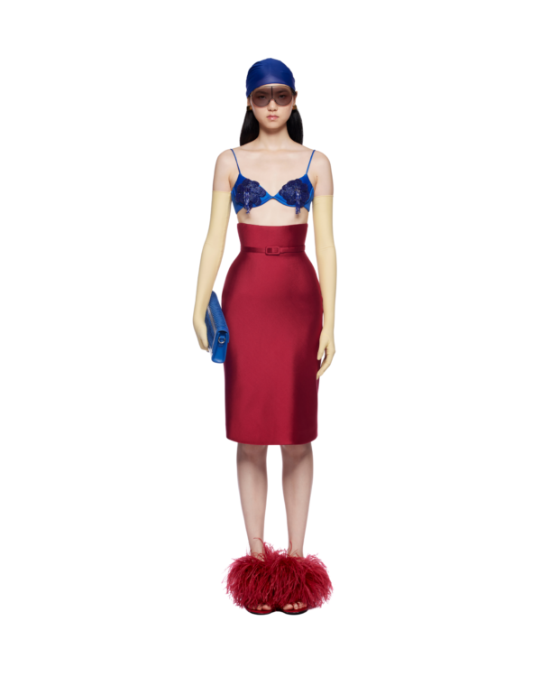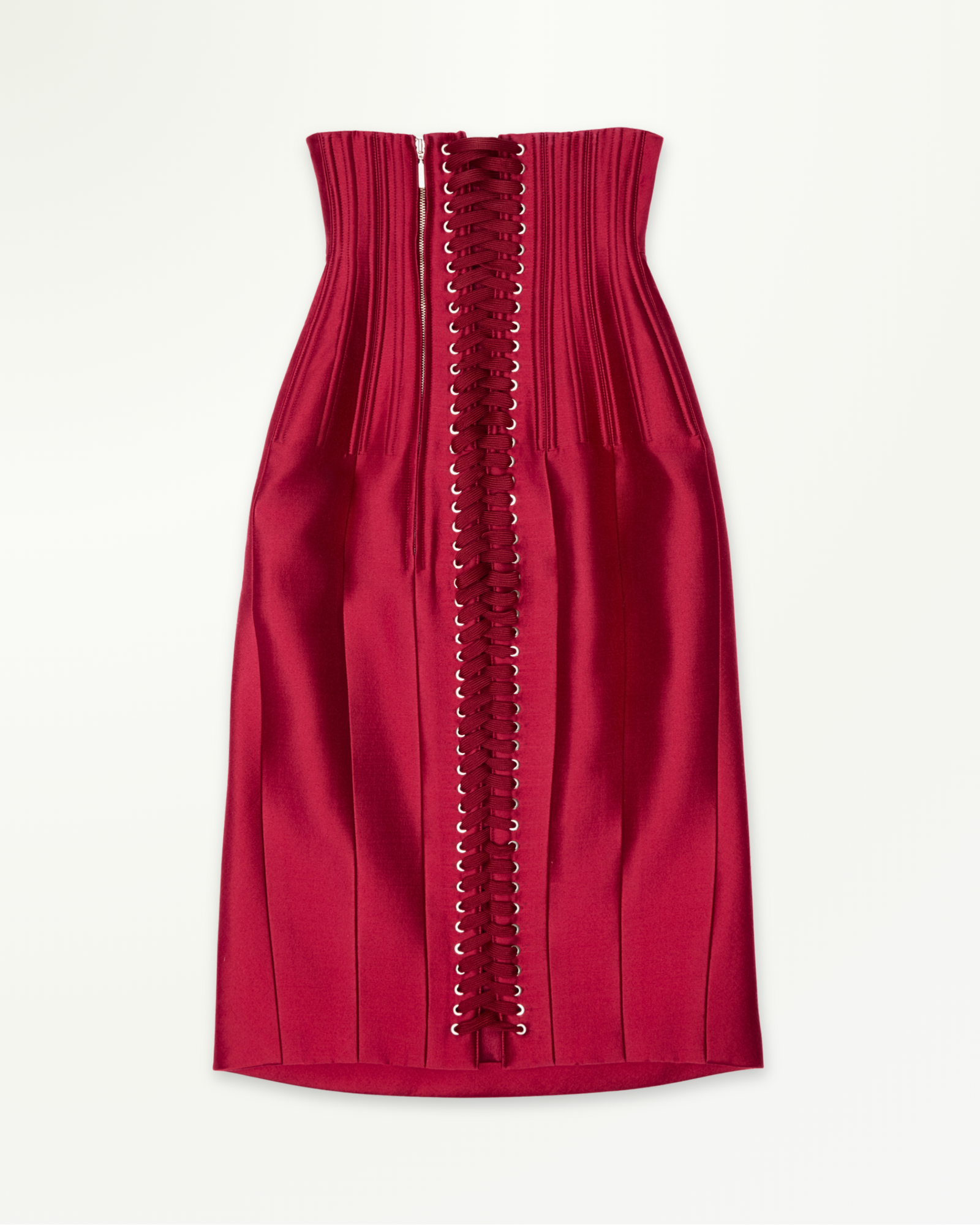 High-waist satin corsetted midi skirt with underbust design and structured boning for a sculpted, hourglass fit. Complete with a fabric belt to accentuate the waist, it pairs beautifully with a blouse, long-sleeve knit, or a beaded bra top for a modern, feminine look.