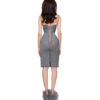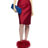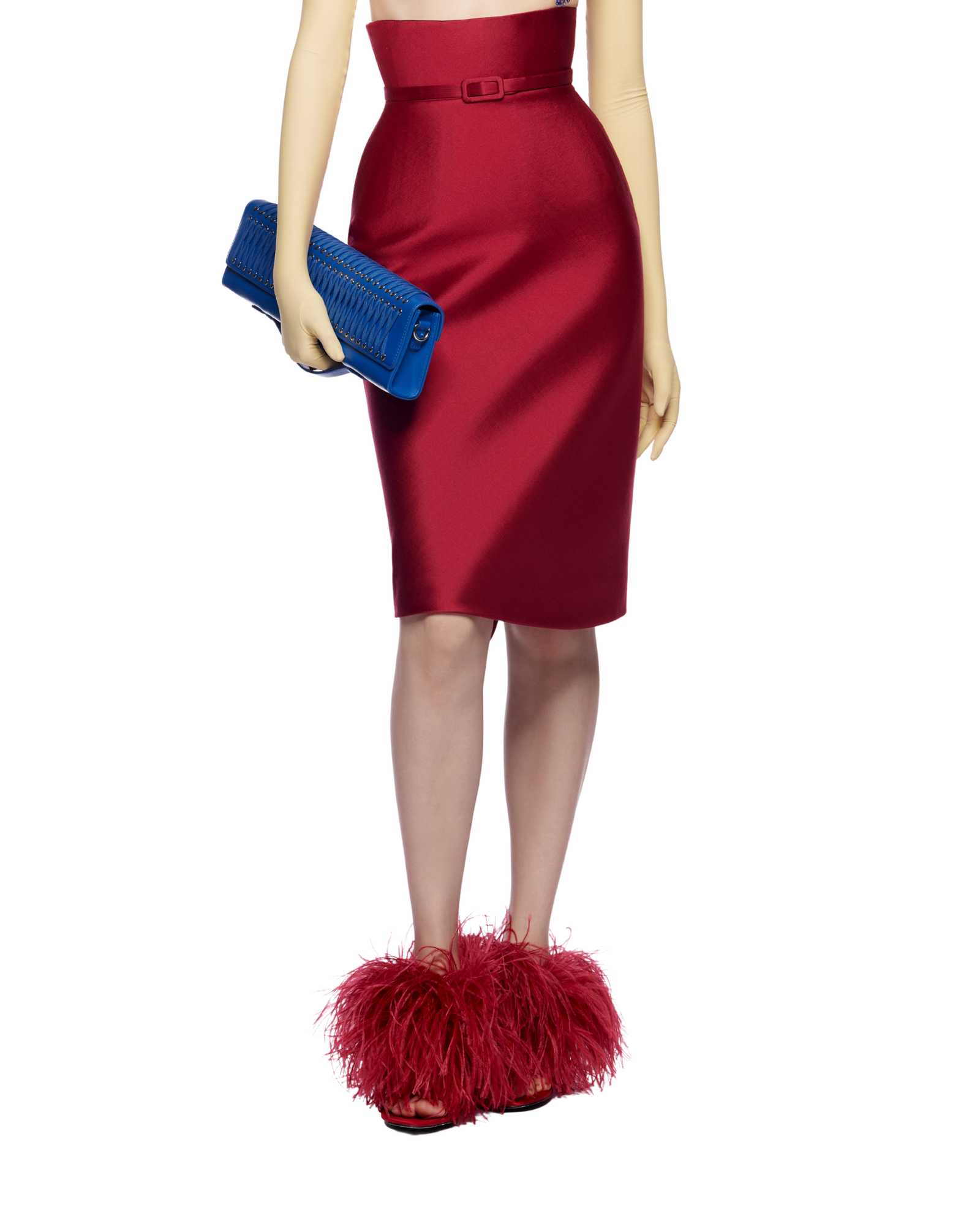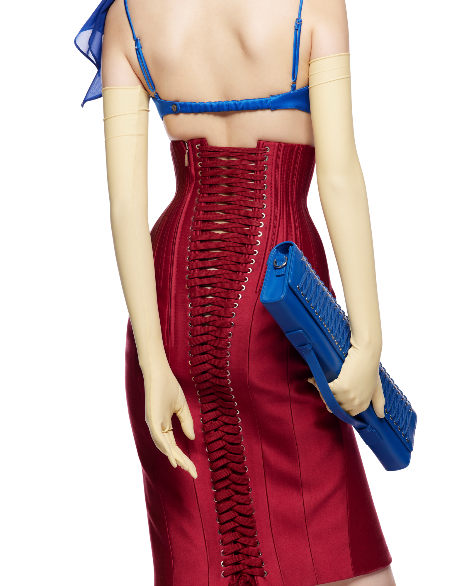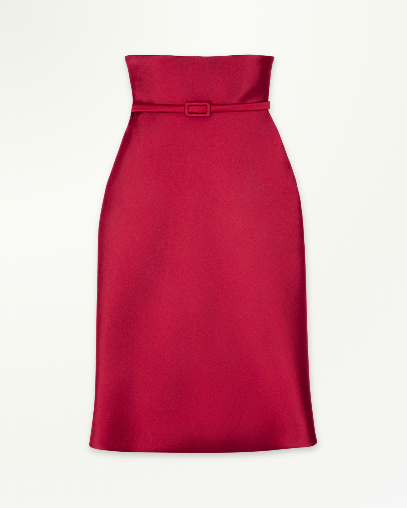 High-waist satin corsetted midi skirt with underbust design and structured boning for a sculpted, hourglass fit. Complete with a fabric belt to accentuate the waist, it pairs beautifully with a blouse, long-sleeve knit, or a beaded bra top for a modern, feminine look.