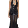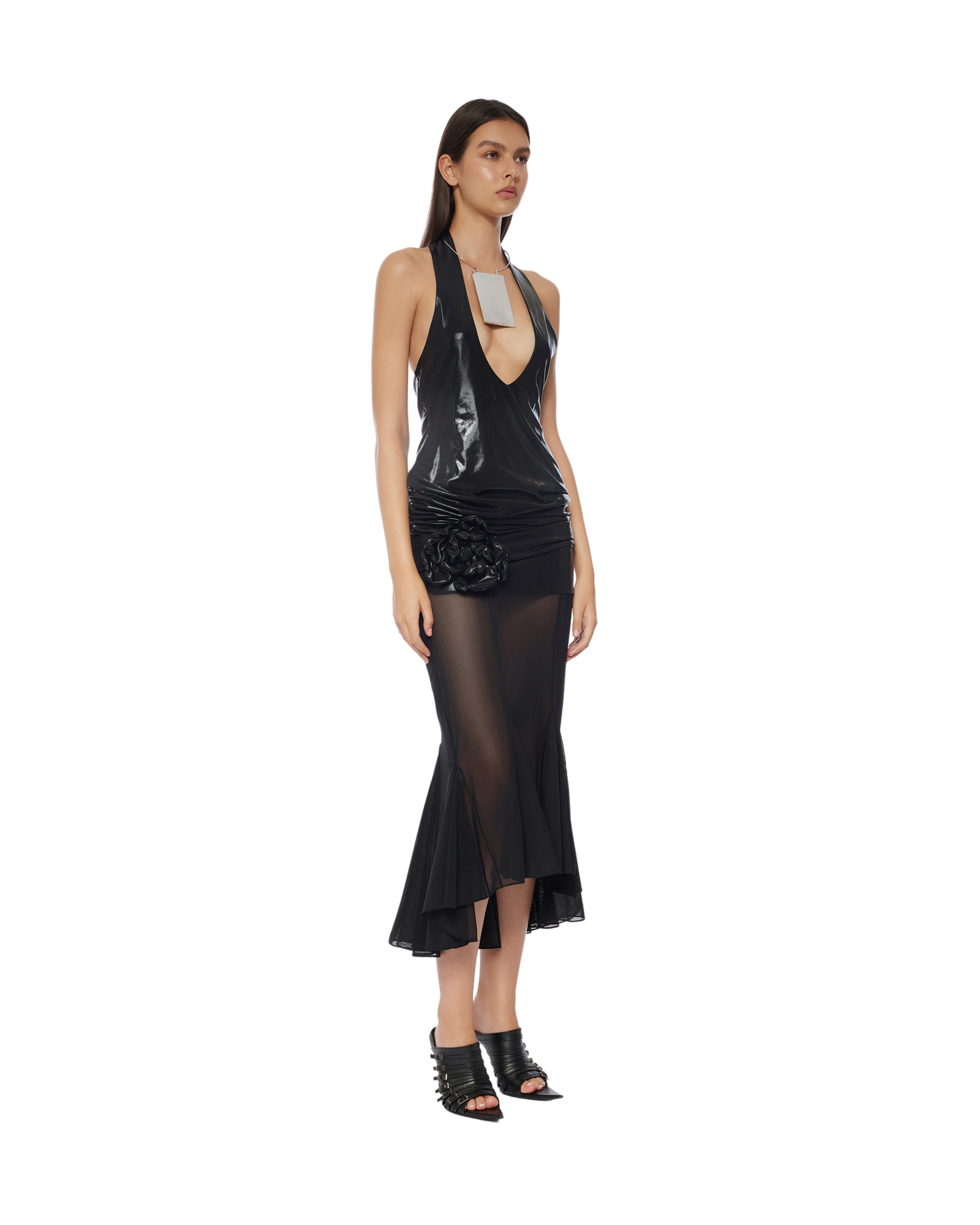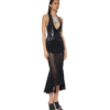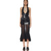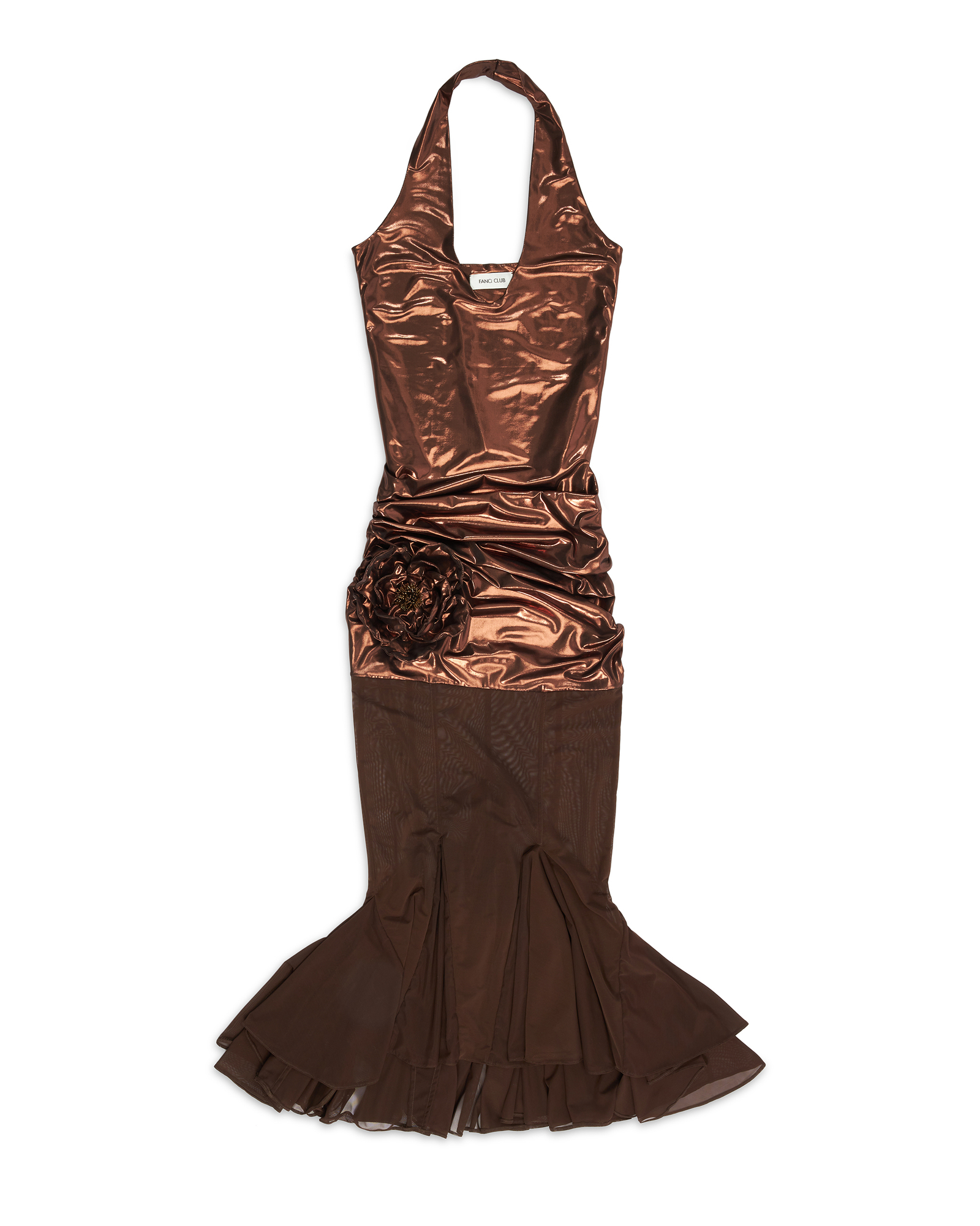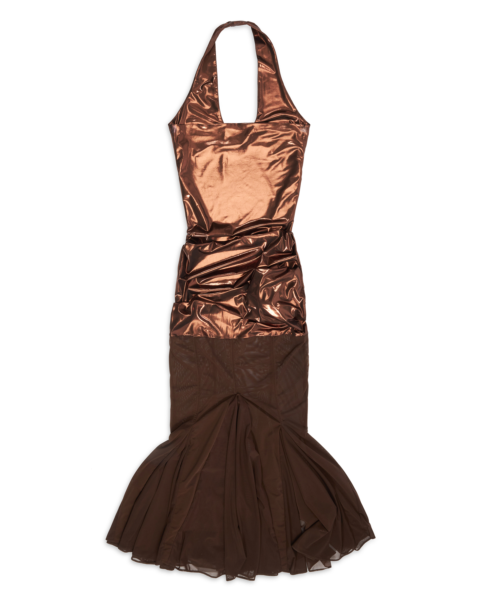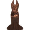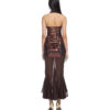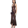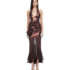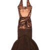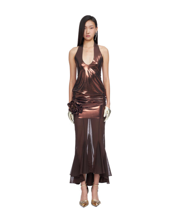Brown nylon metallic and semi-sheer stretch nylon mesh fishtail midi dress