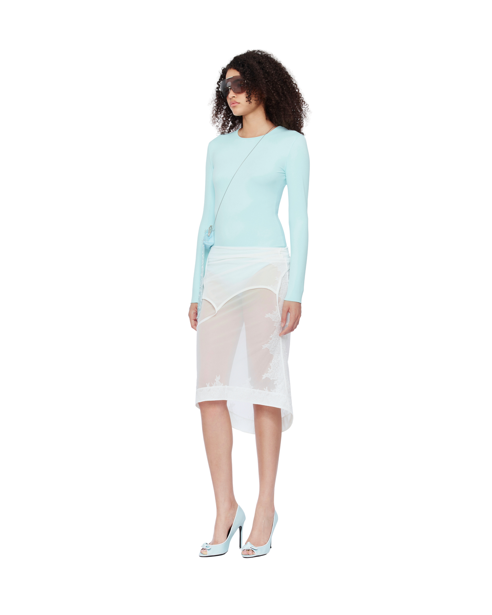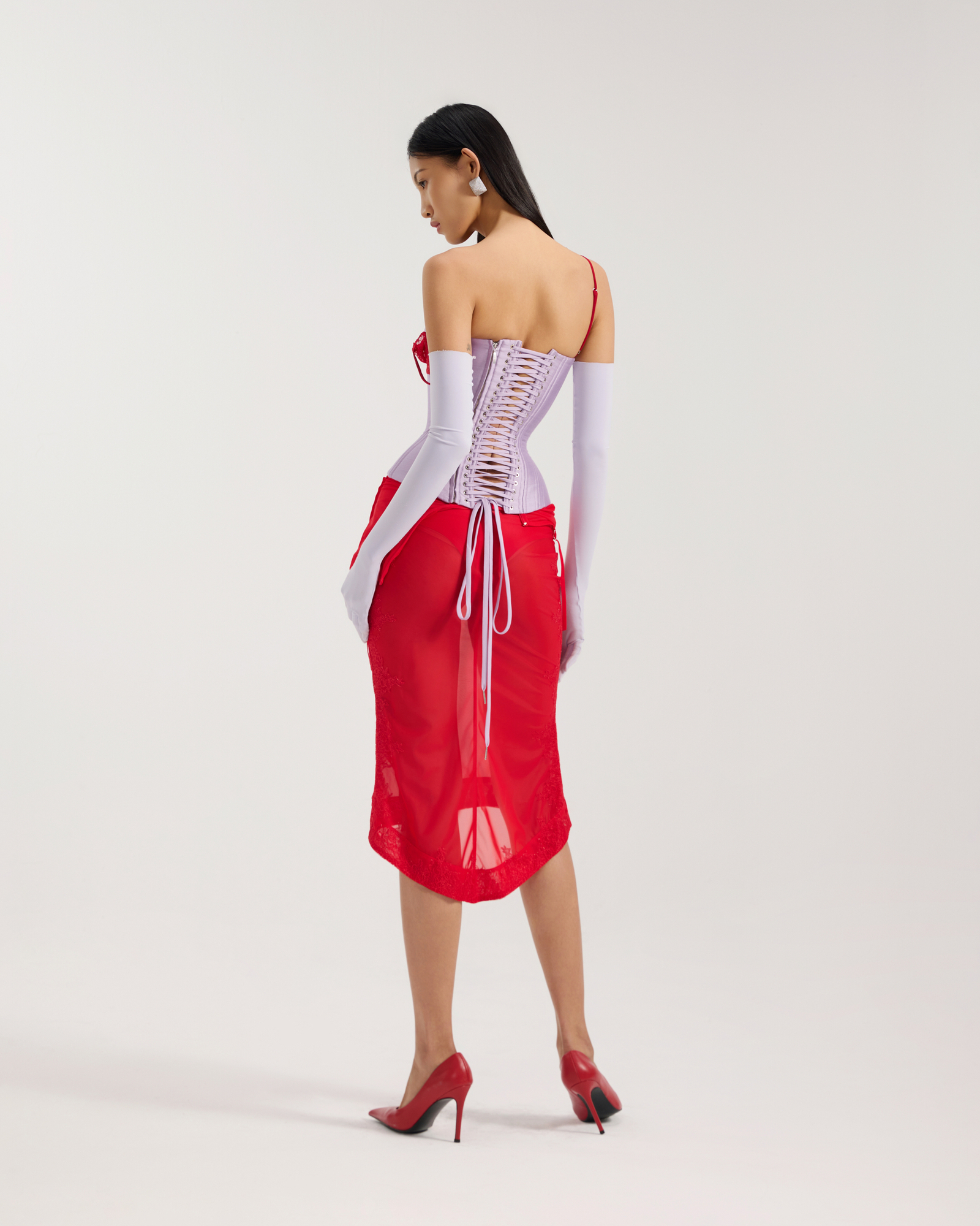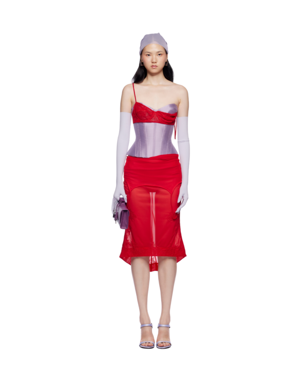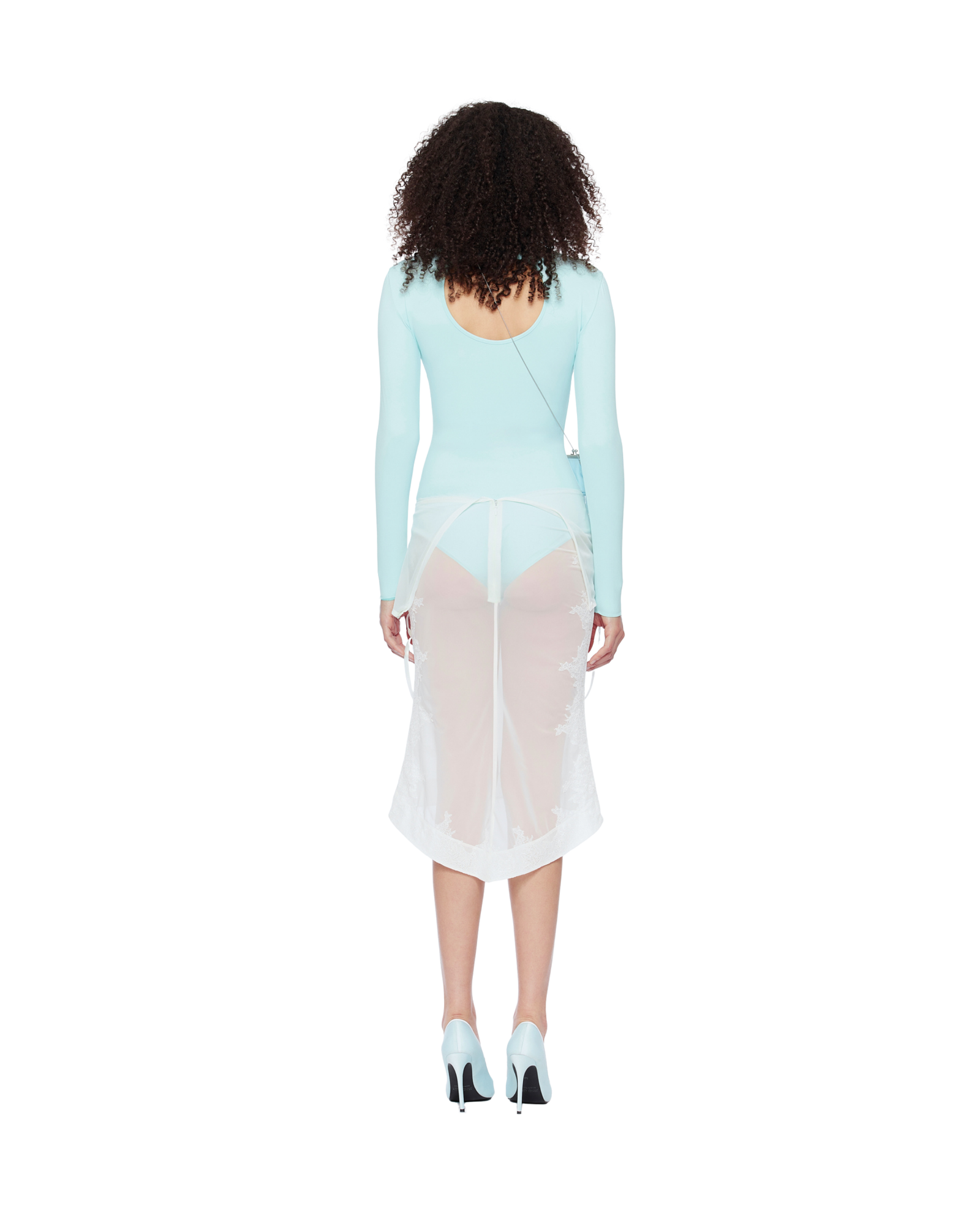 A deconstructed midi skirt with a dress-style construction that can also be worn as a dress. Semi-sheer with a high-low hem, lace appliqué highlights the side seams and hem, creating a mysterious, unfinished aesthetic. Style it with a corset layered over a bra, a blouse, a jacket, or strappy tops with gloves for a contemporary, edgy look.