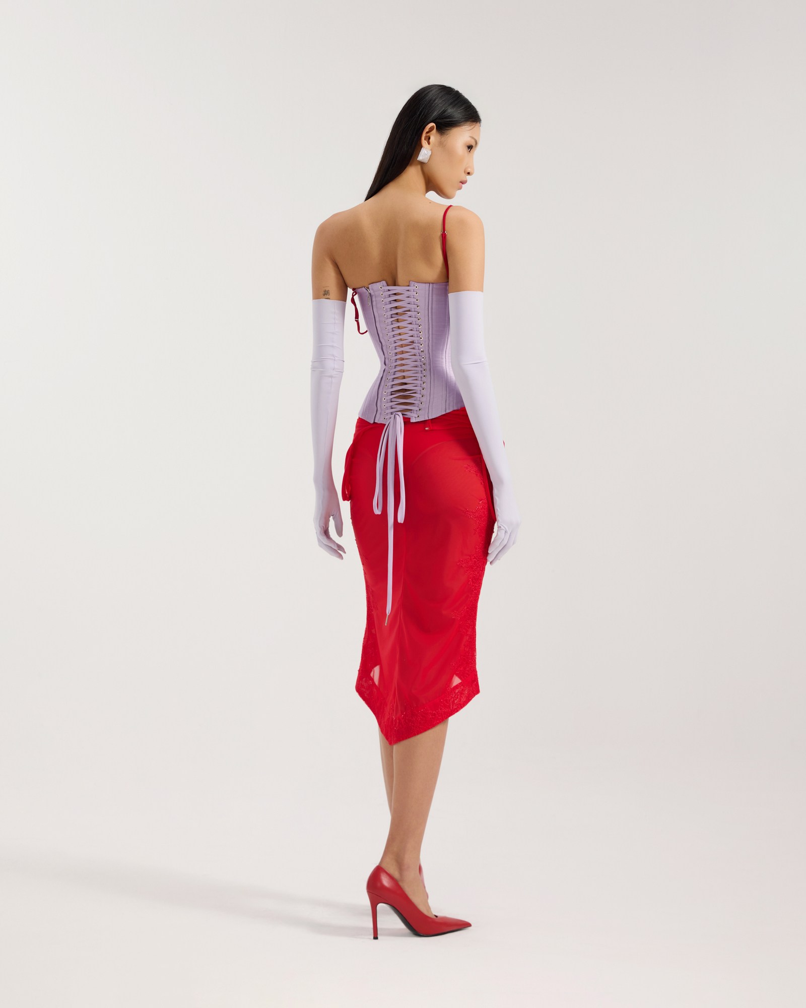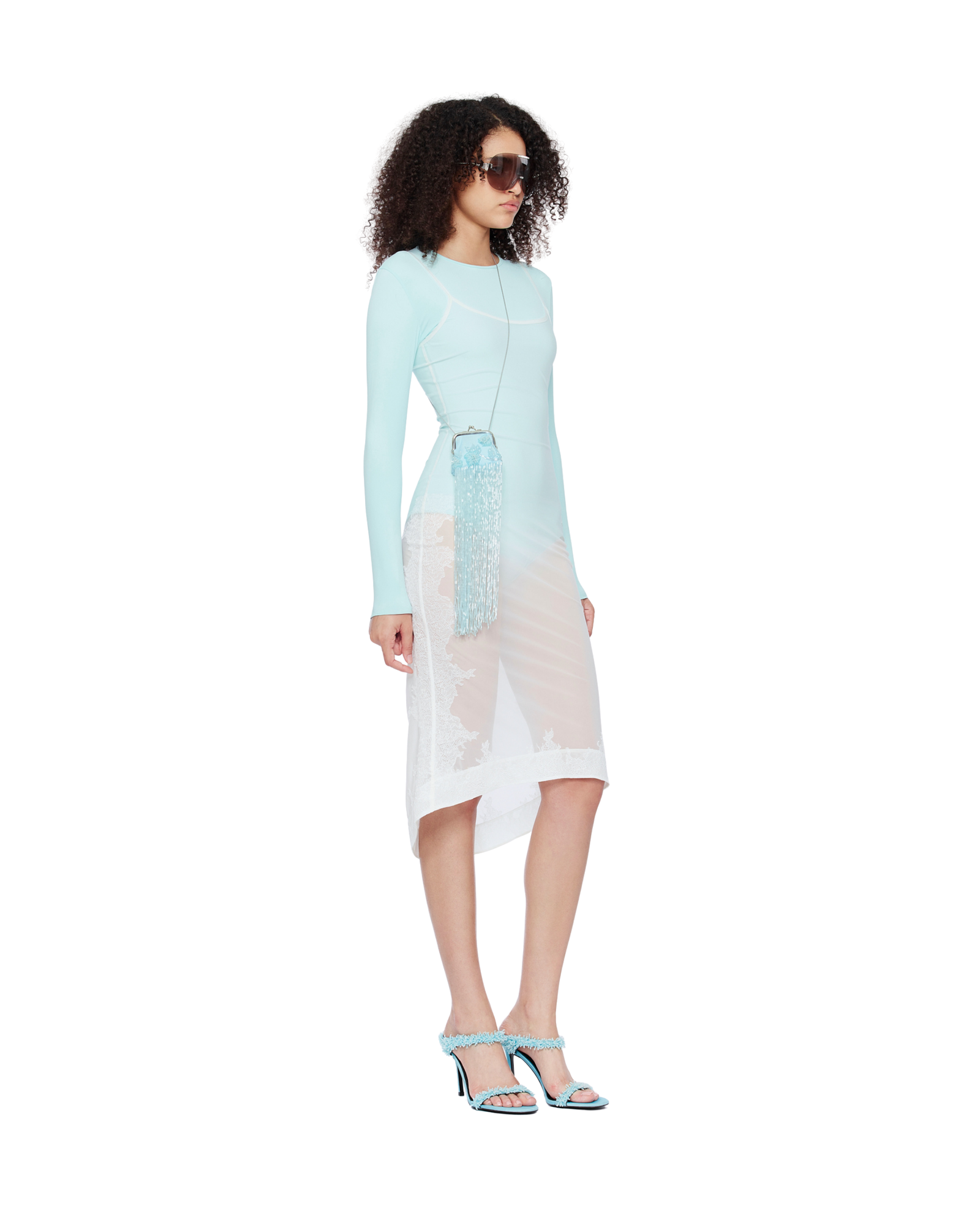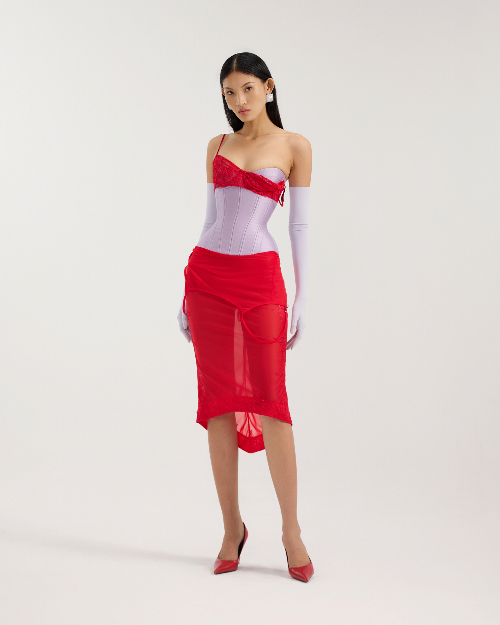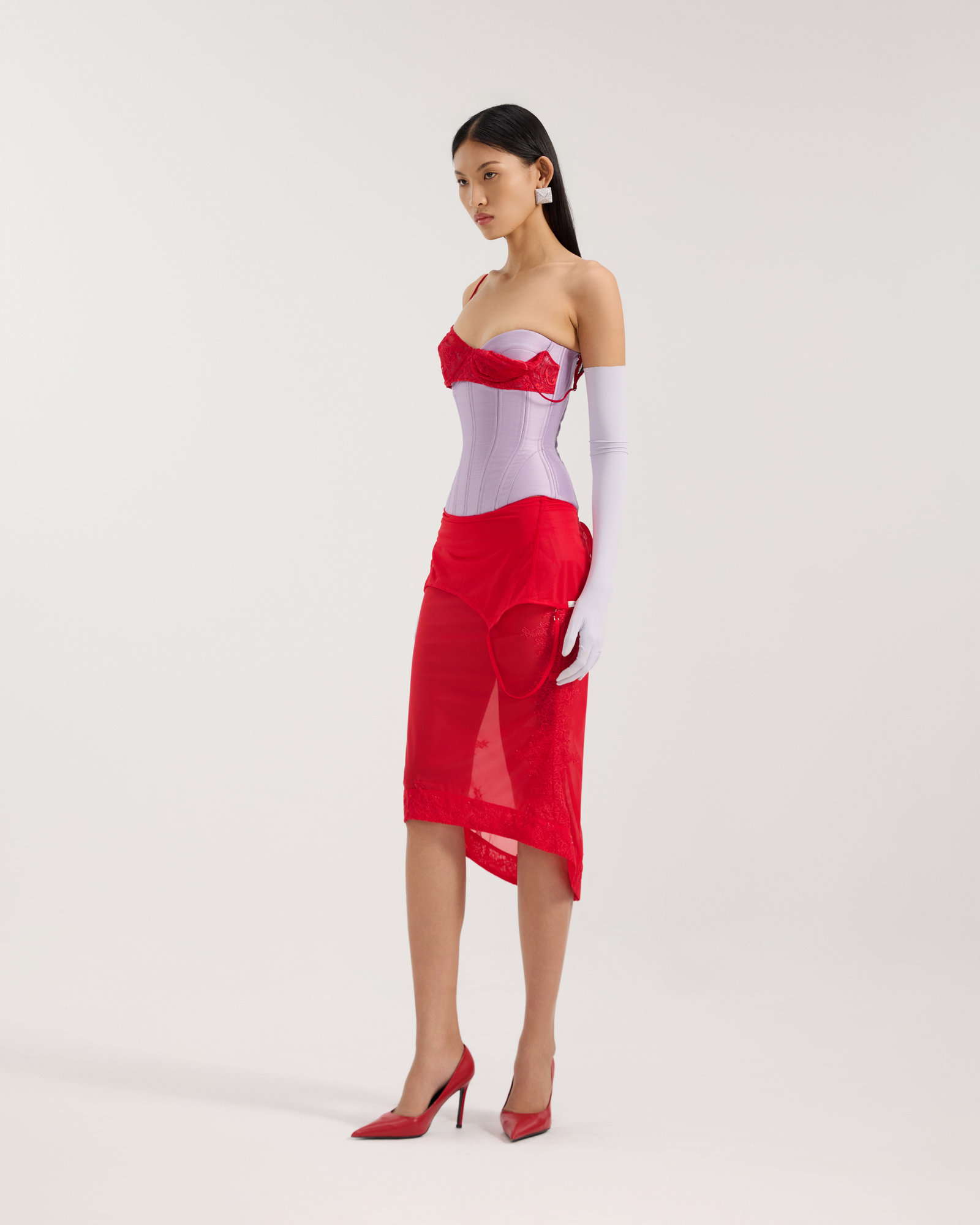 A deconstructed midi skirt with a dress-style construction that can also be worn as a dress. Semi-sheer with a high-low hem, lace appliqué highlights the side seams and hem, creating a mysterious, unfinished aesthetic. Style it with a corset layered over a bra, a blouse, a jacket, or strappy tops with gloves for a contemporary, edgy look.