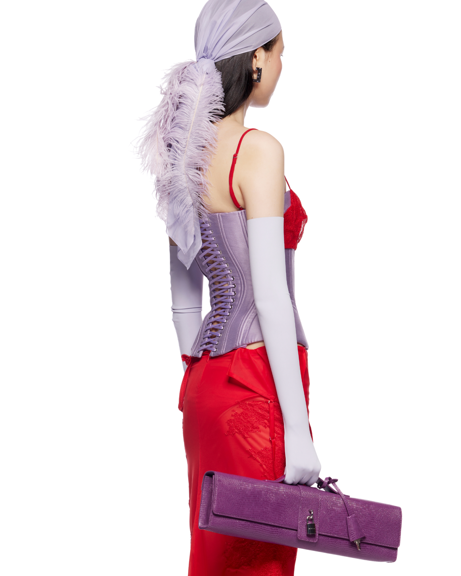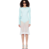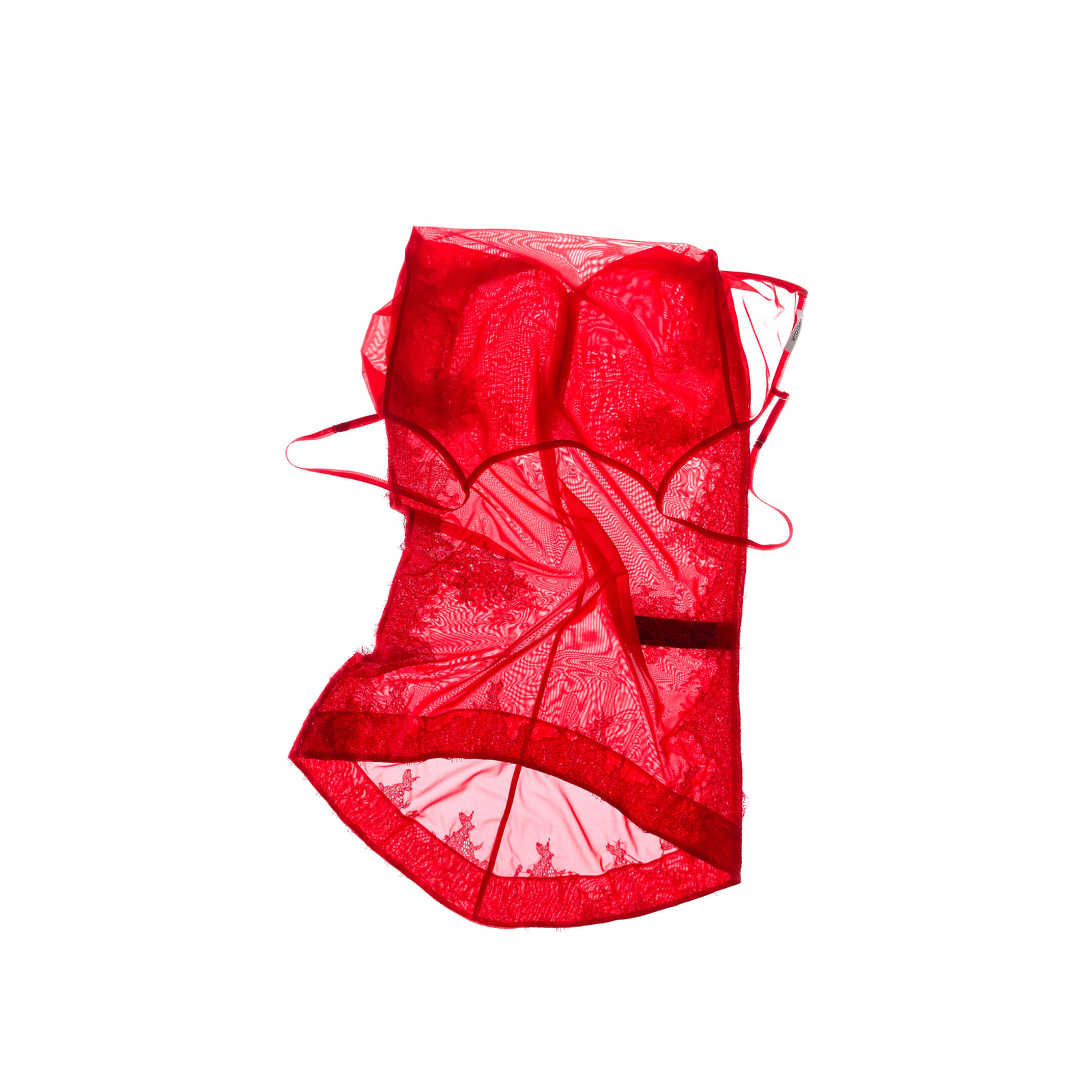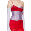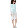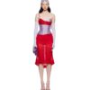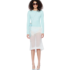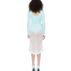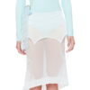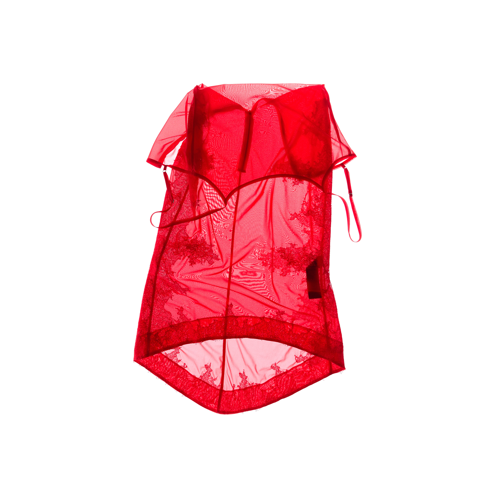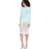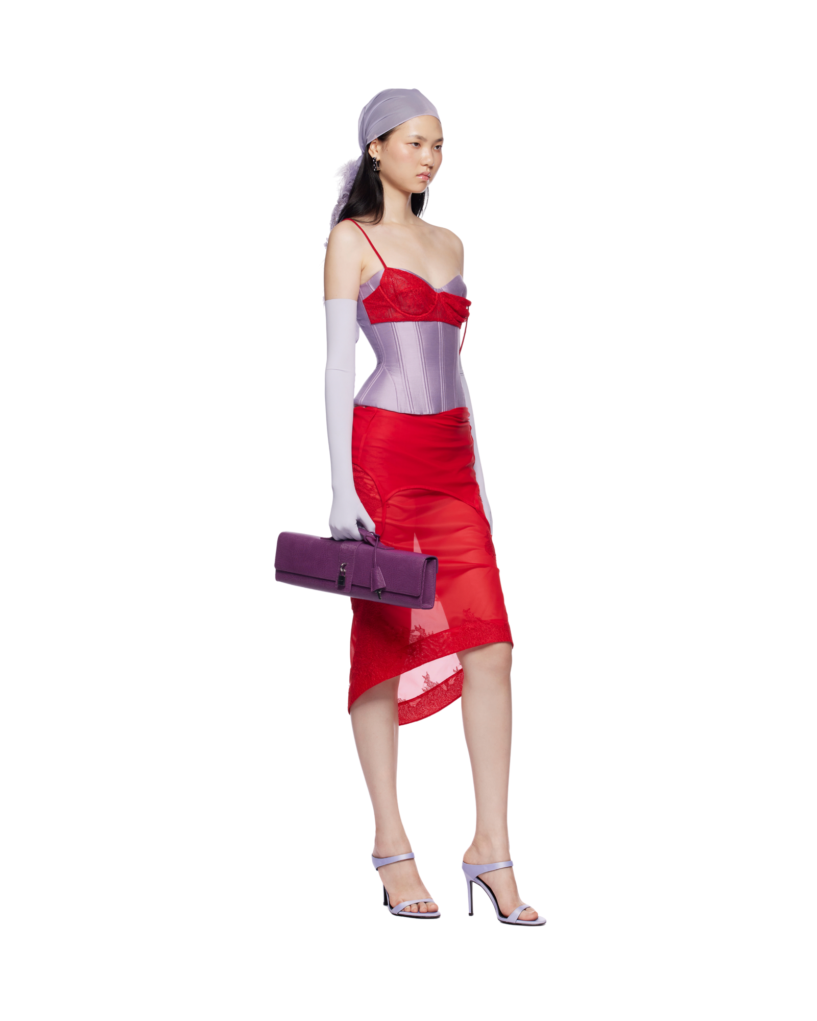 A deconstructed midi skirt with a dress-style construction that can also be worn as a dress. Semi-sheer with a high-low hem, lace appliqué highlights the side seams and hem, creating a mysterious, unfinished aesthetic. Style it with a corset layered over a bra, a blouse, a jacket, or strappy tops with gloves for a contemporary, edgy look.