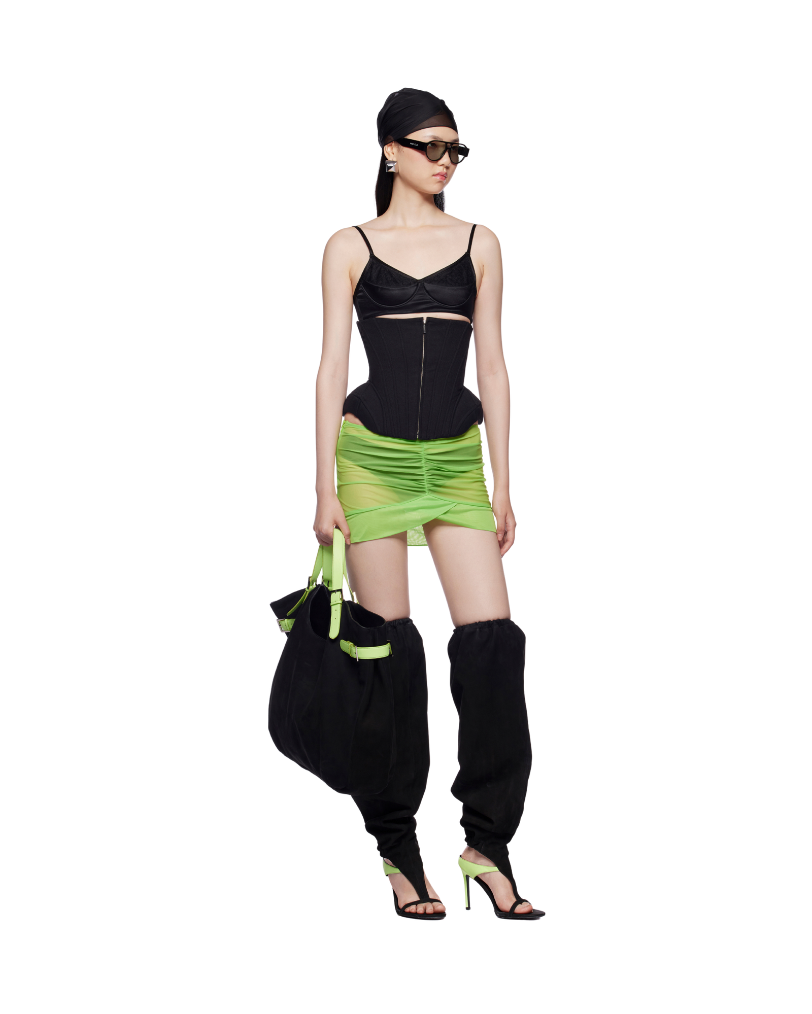 Ruched mini skirt with an asymmetric hem that falls longer at the back, finished with a delicate cluster of 3D flowers at the back. Pair with a bikini set, fitted bodysuit, cropped knit, or a sharp corset for contrast