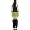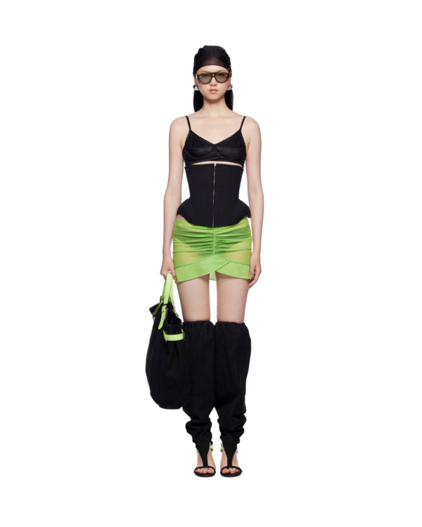 Ruched mini skirt with an asymmetric hem that falls longer at the back, finished with a delicate cluster of 3D flowers at the back. Pair with a bikini set, fitted bodysuit, cropped knit, or a sharp corset for contrast