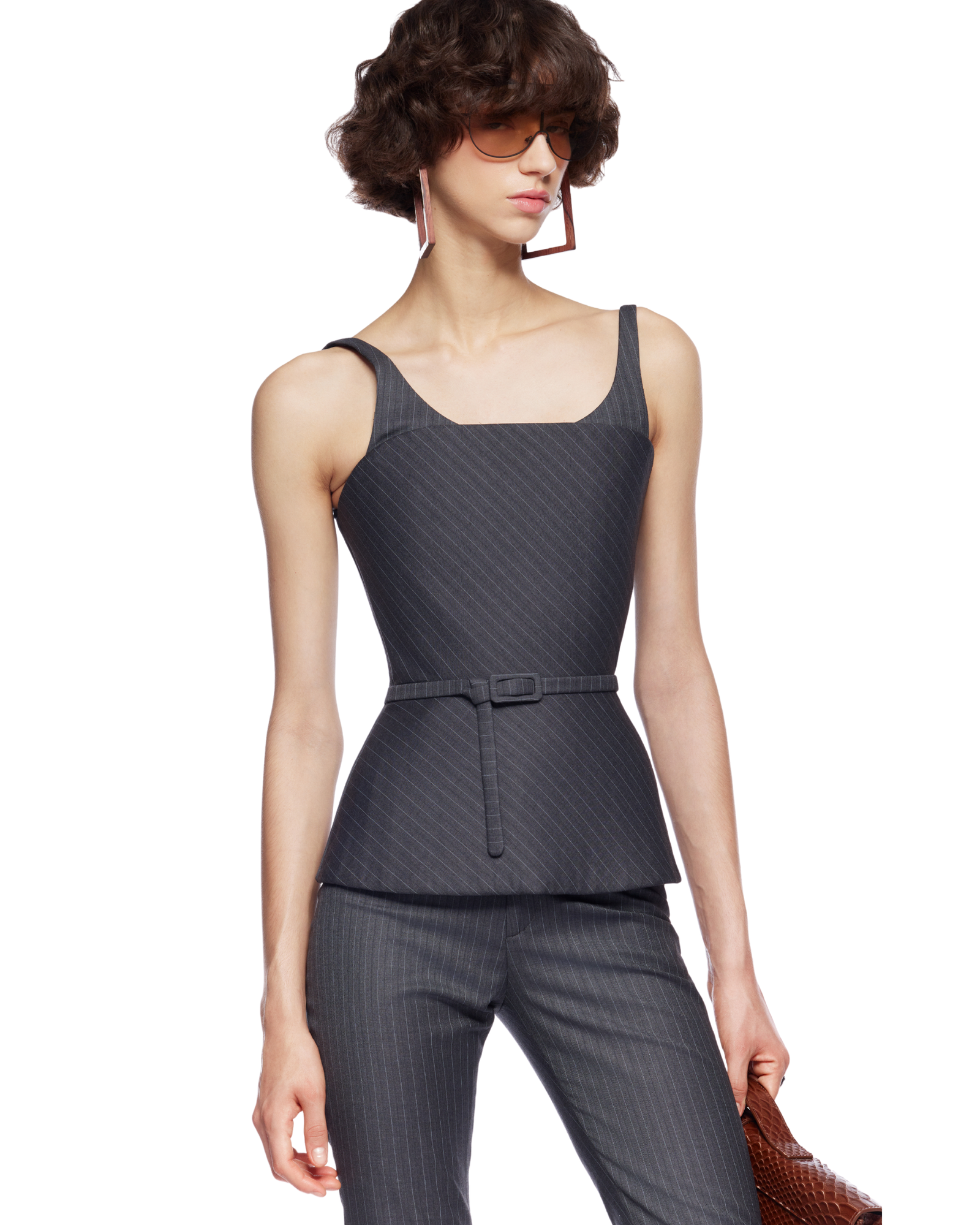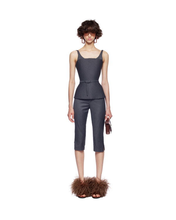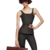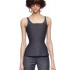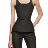 The wool-blend tank top corset features contour boning throughout, cinching the waist for a sharp hourglass effect. With minimal panel cuts and a smooth surface that conceals the frame, it creates a polished finish. Effortlessly versatile, this corset pairs beautifully with cropped leggings, mini skirts, or tailored shorts.
