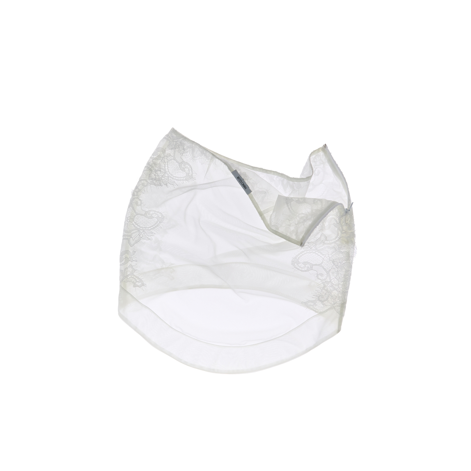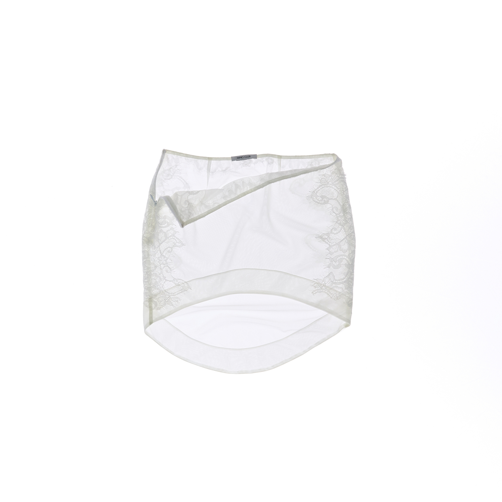 A sheer chiffon mini skirt with high-low hem and low-rise fit, adorned with lace appliqué and delicate hand-beaded details at the hip. Almost fully transparent, it creates a daring effect while highlighting feminine details, and layers perfectly over a bikini brief, paired with a bright sheer blouse or a corset for a bold, contemporary look.