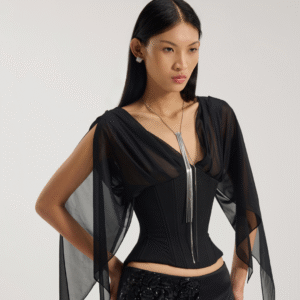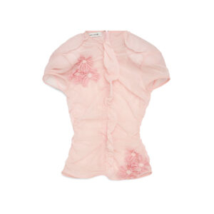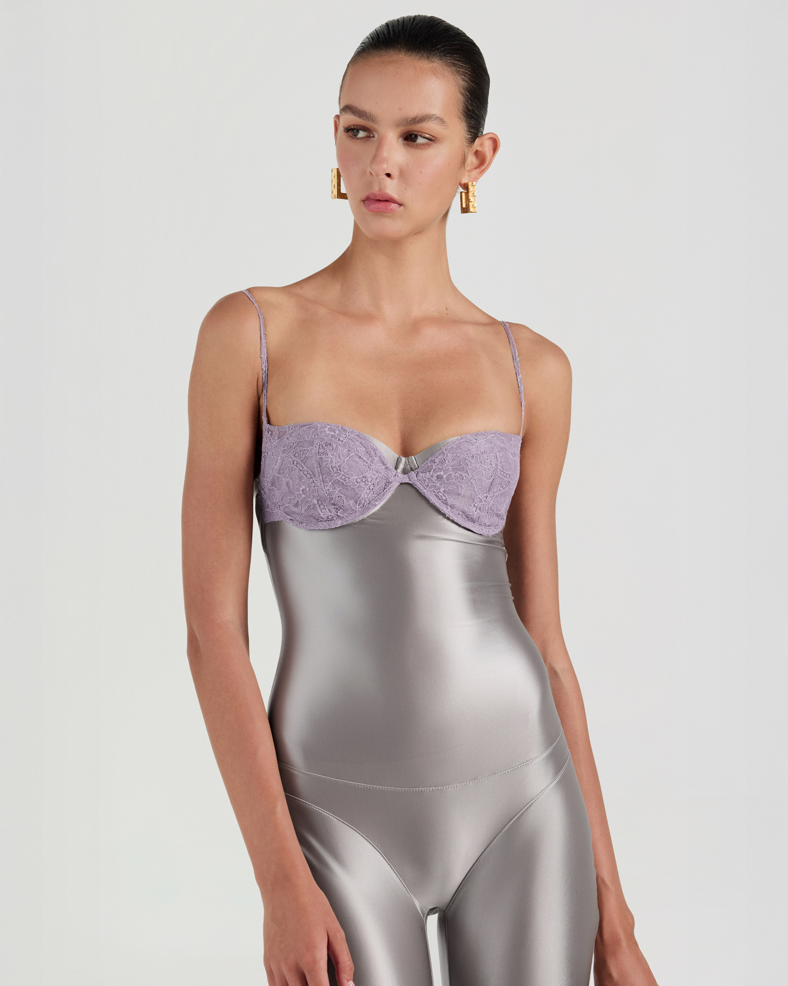 Inspired by lingerie aesthetics, this capri-length jumpsuit presents a soft yet refined expression. An attached lace bra defines the upper body, adding feminine detail and visual depth.