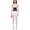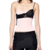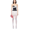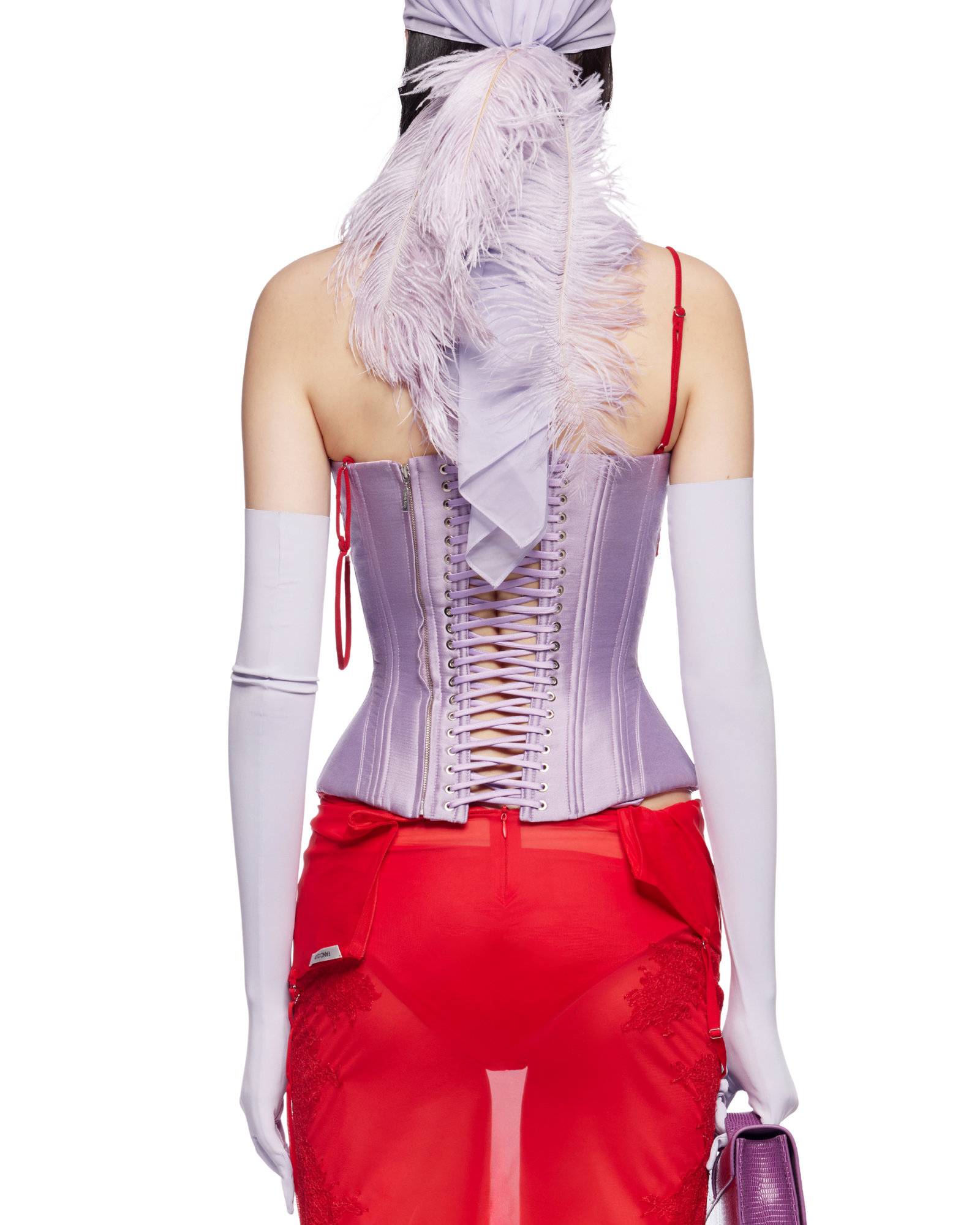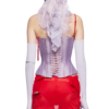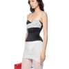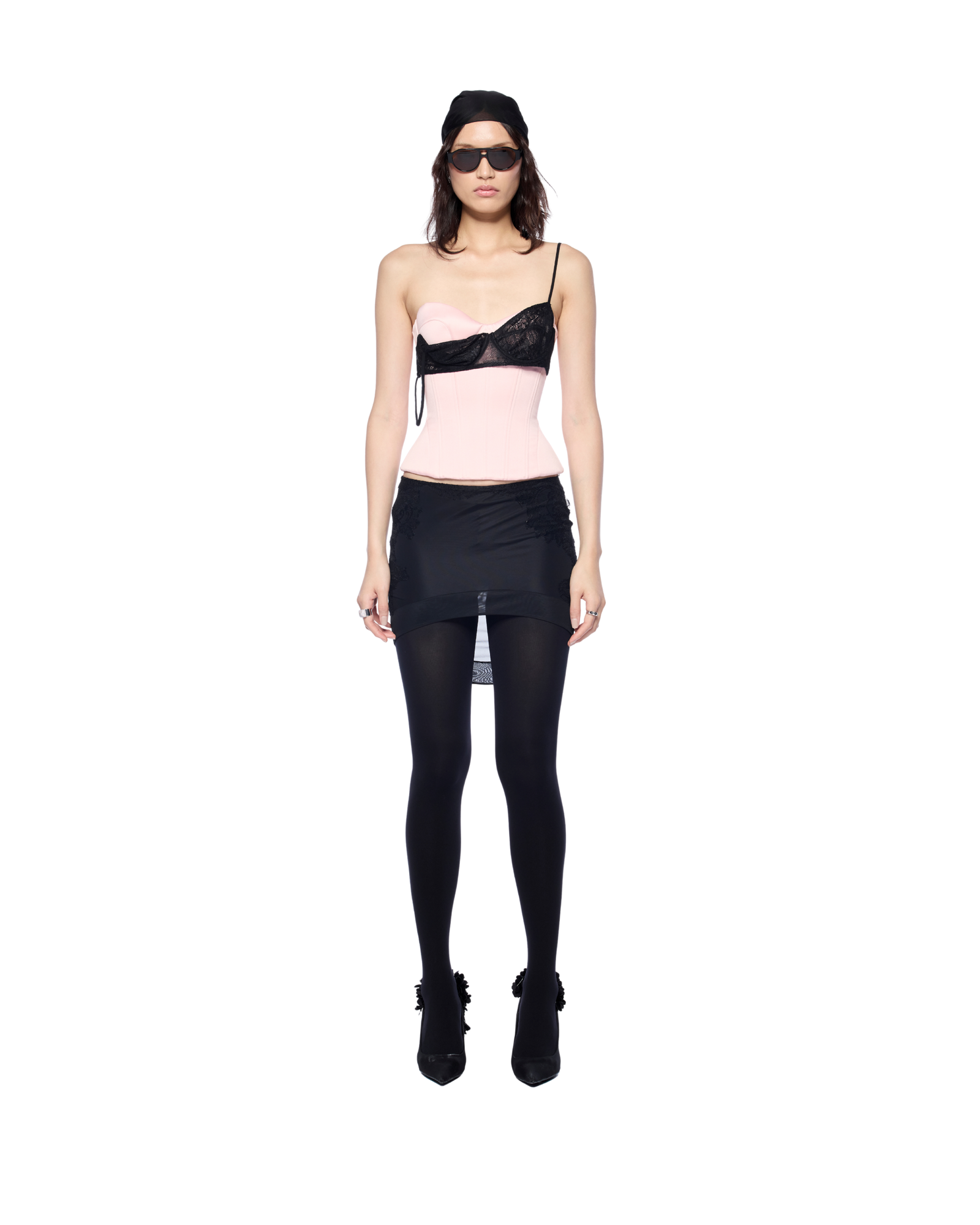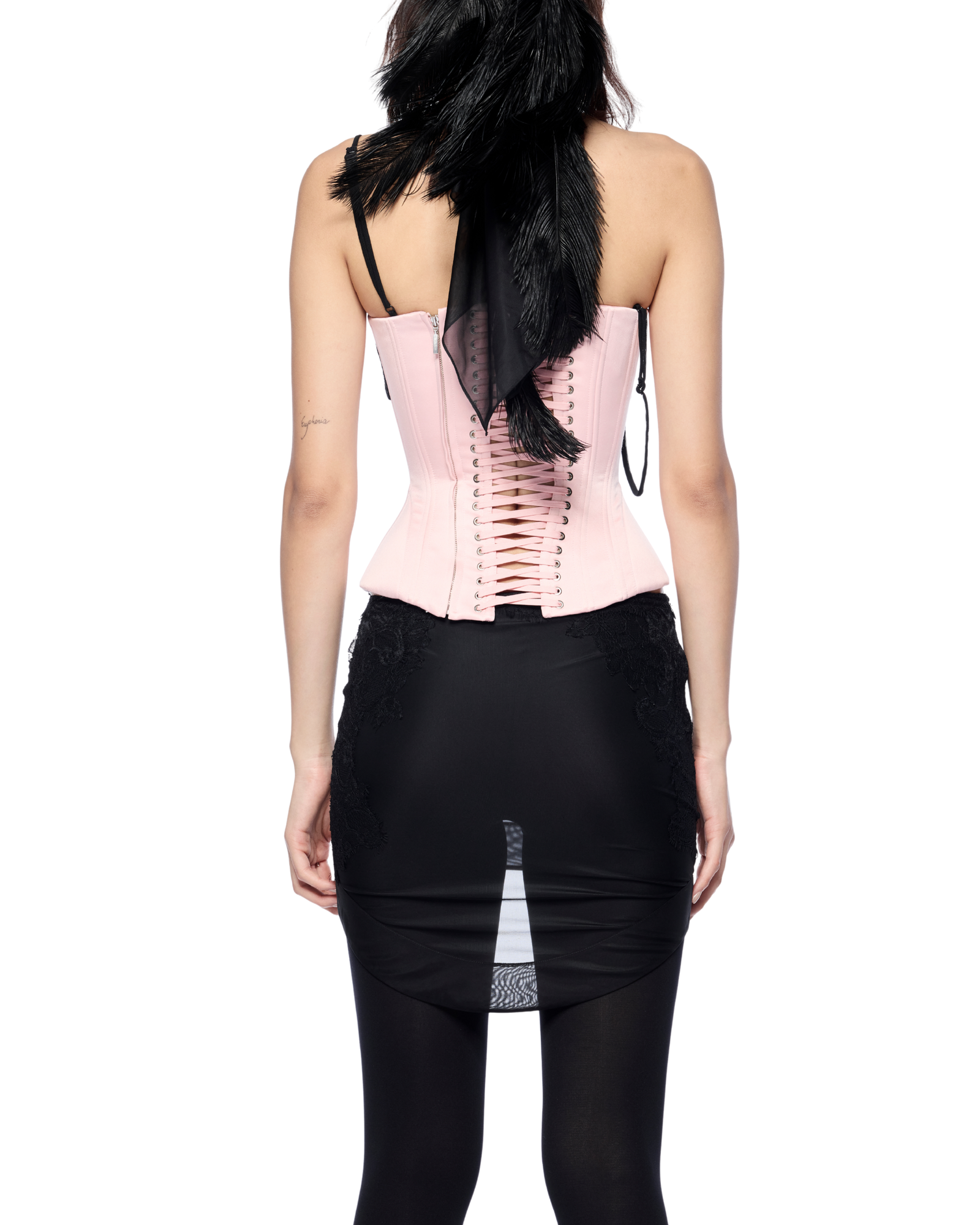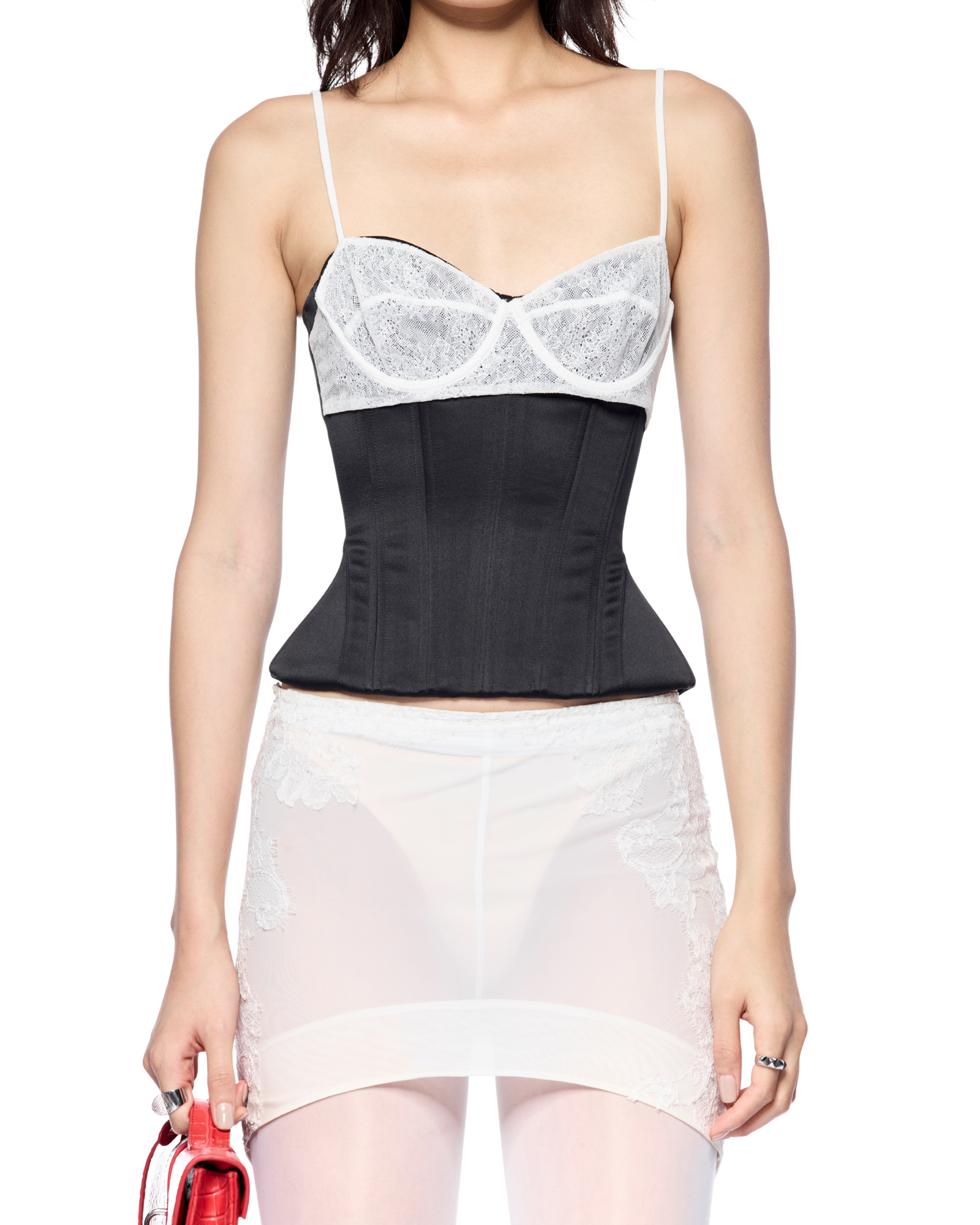 A daring hybrid design that layers a lace bra over a corset base, creating a striking play of contrast and texture. The padded bust and hips sculpt an hourglass silhouette, lacing at back. Pair with a mini skirt, fitted trousers, or even swimwear for a bold styling state.
