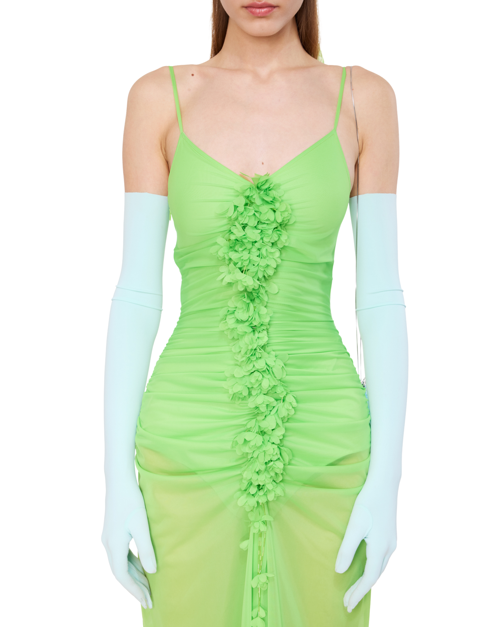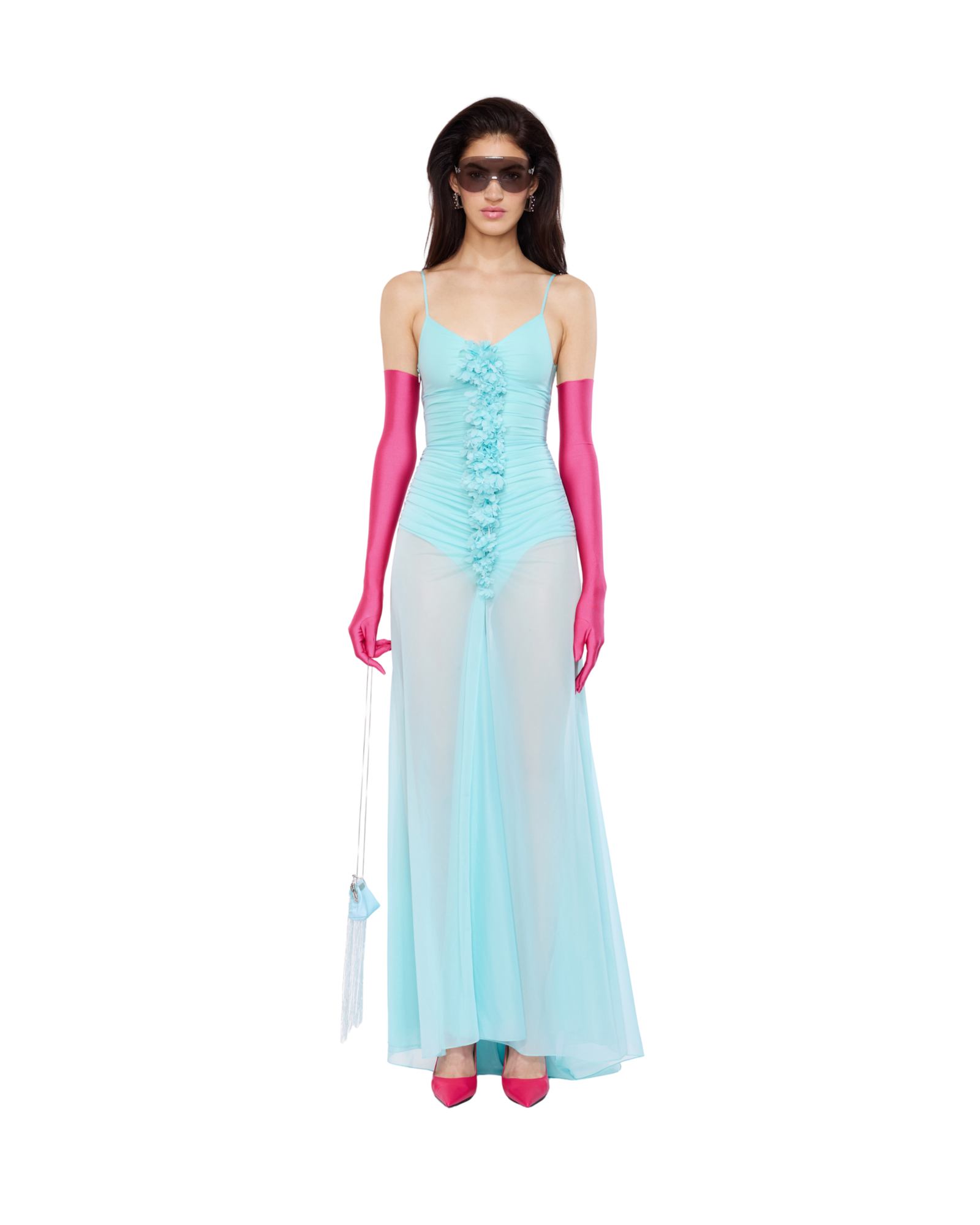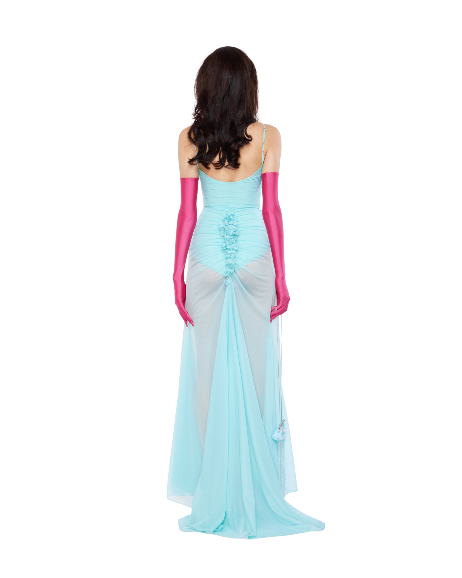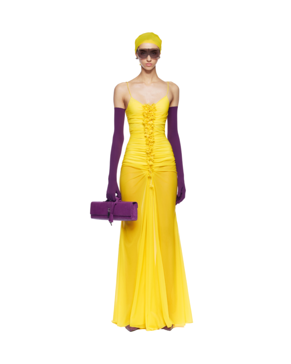 This ruched floral maxi dress that hugs the body with gathered seams, balanced by a plunging neckline and a draped hem slit. Laser-cut flowers cascade in clusters at the front and back, the inner bodysuit ensures both support and ease. Style it with beaded mini bags or elongated clutches, finished with long gloves for a statement evening look.