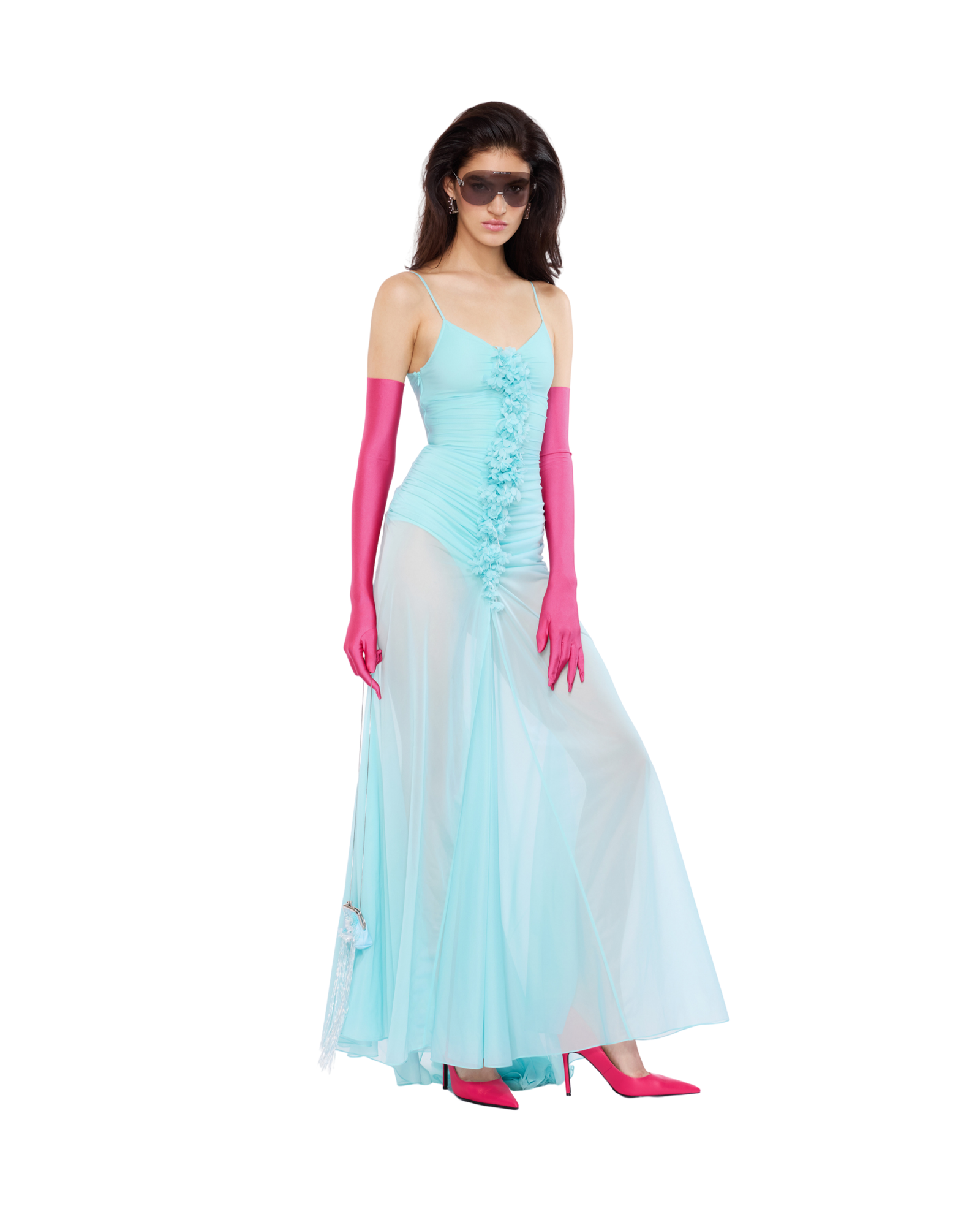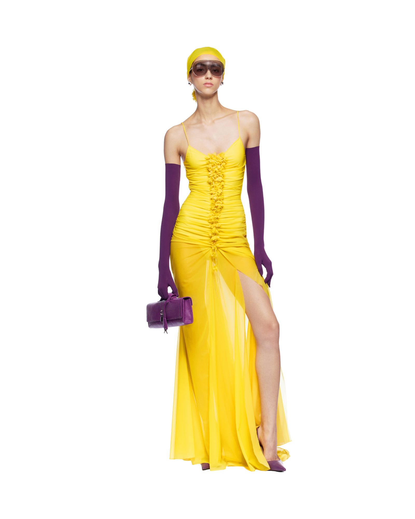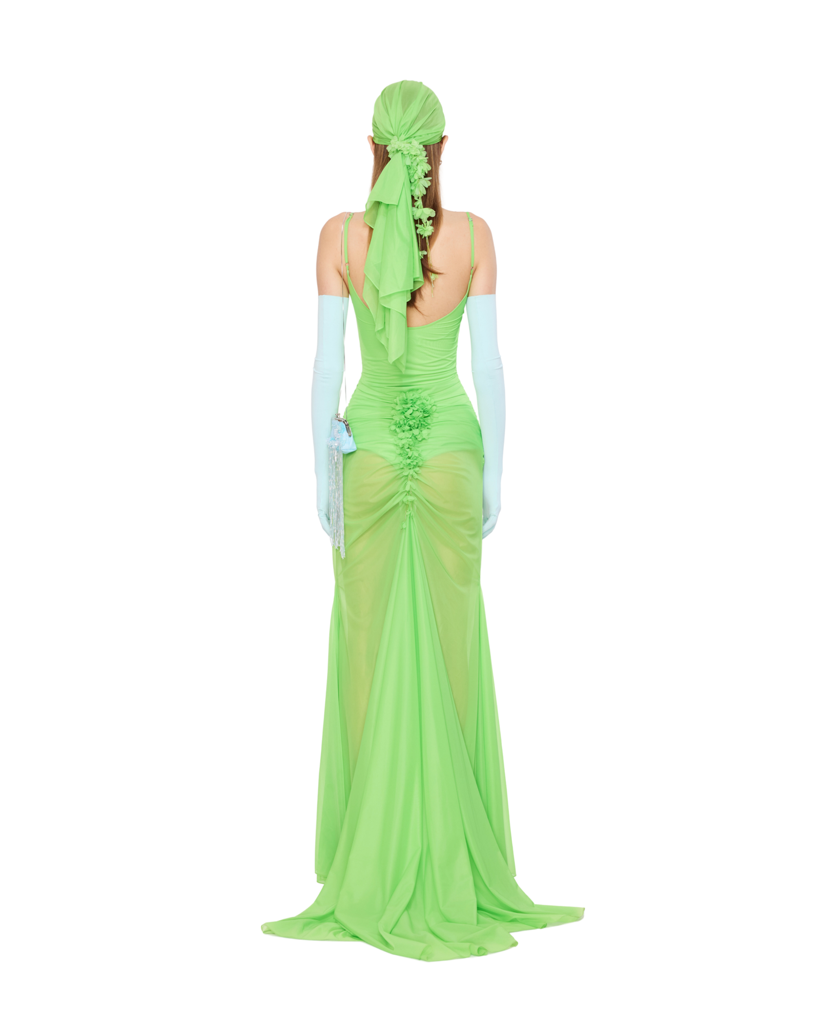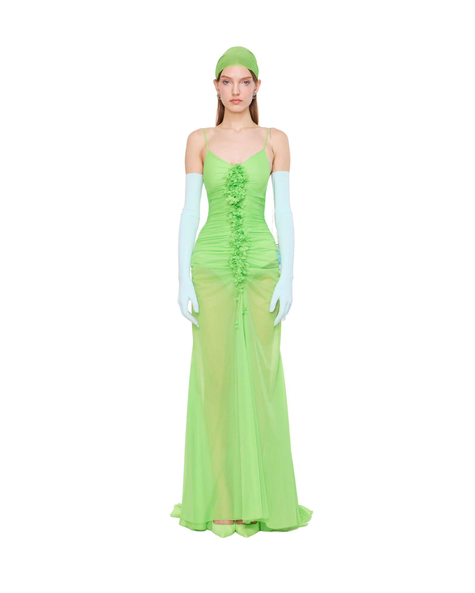 This ruched floral maxi dress that hugs the body with gathered seams, balanced by a plunging neckline and a draped hem slit. Laser-cut flowers cascade in clusters at the front and back, the inner bodysuit ensures both support and ease. Style it with beaded mini bags or elongated clutches, finished with long gloves for a statement evening look.