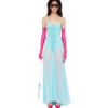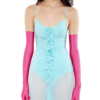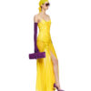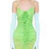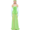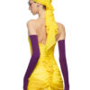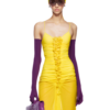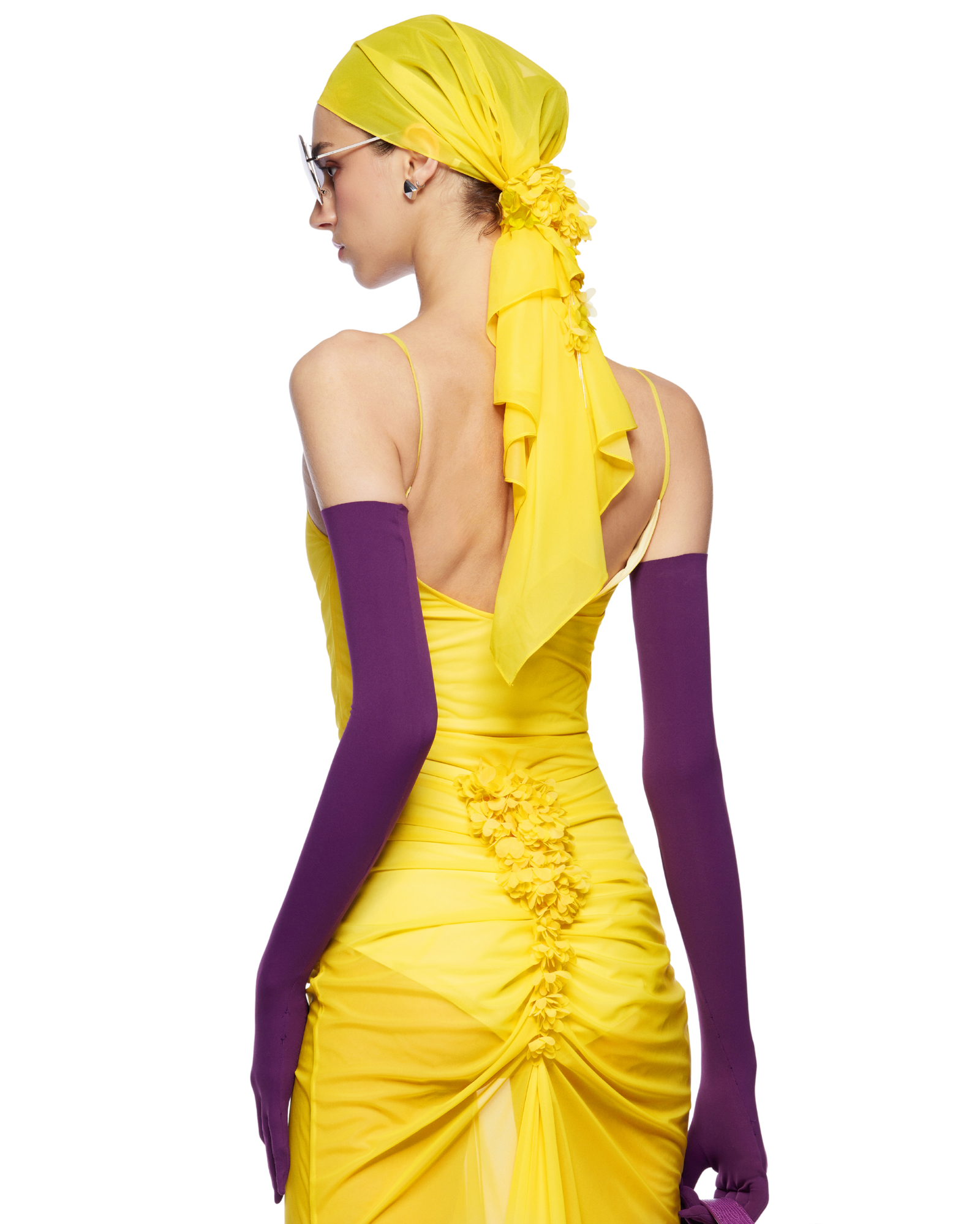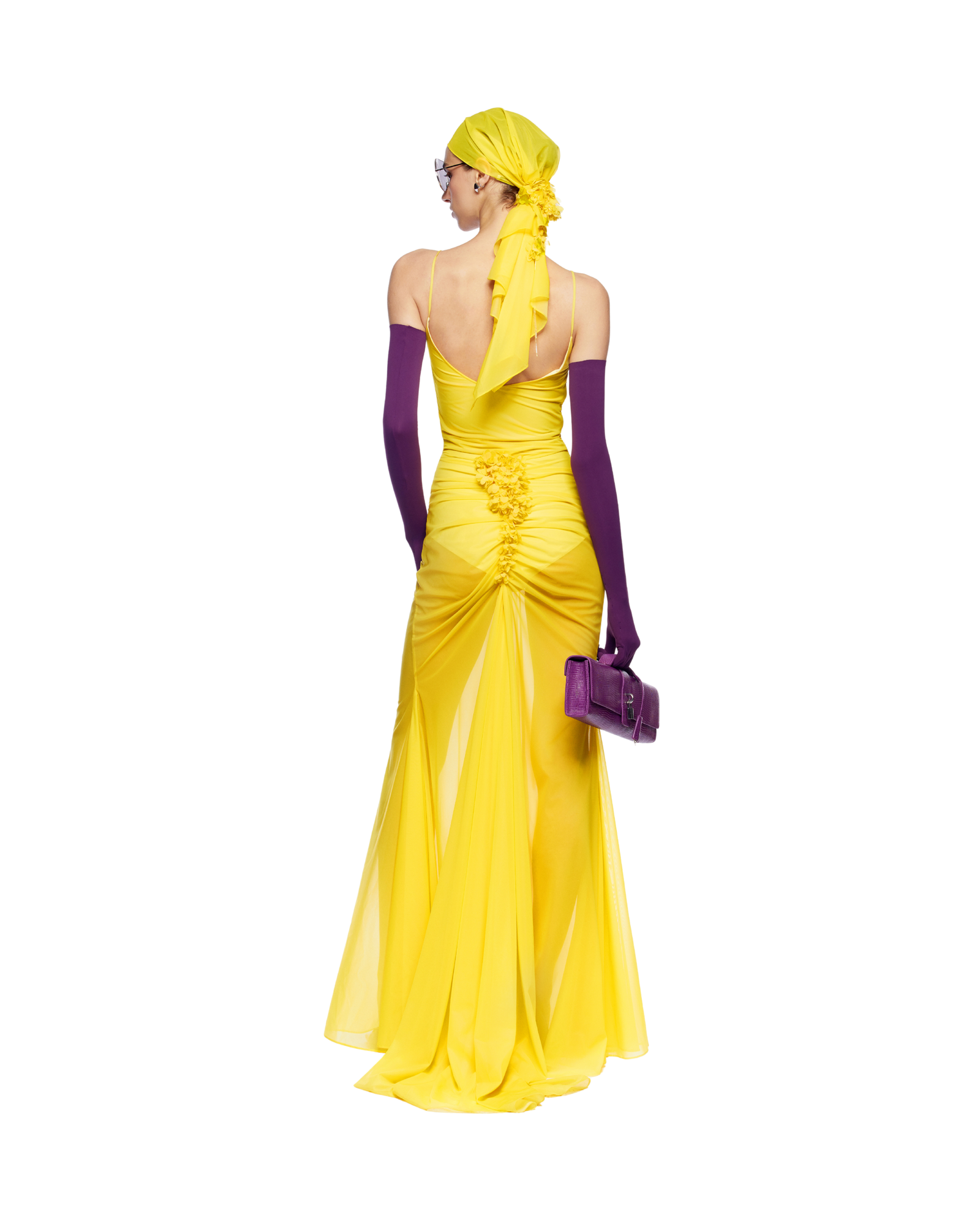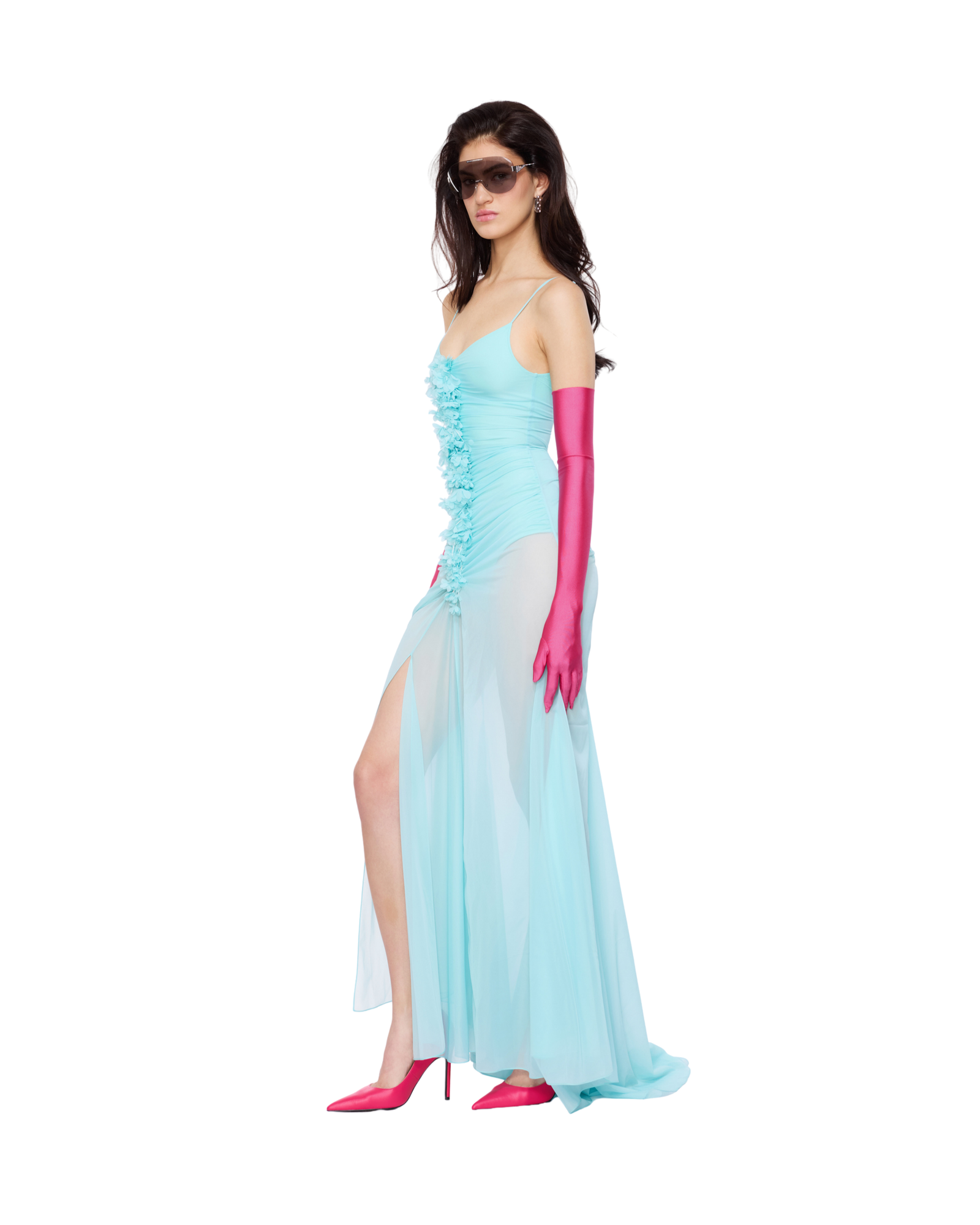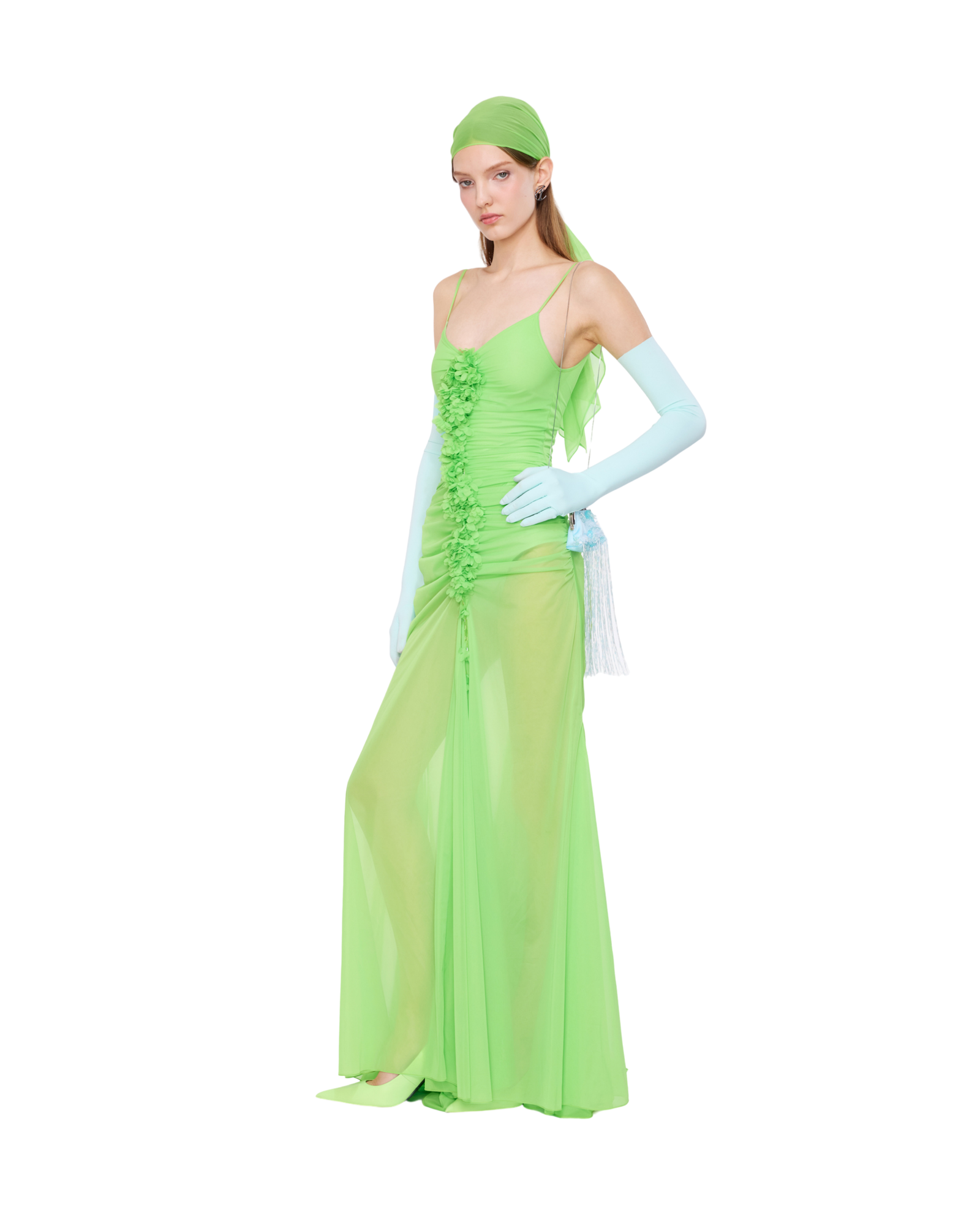This ruched floral maxi dress that hugs the body with gathered seams, balanced by a plunging neckline and a draped hem slit. Laser-cut flowers cascade in clusters at the front and back, the inner bodysuit ensures both support and ease. Style it with beaded mini bags or elongated clutches, finished with long gloves for a statement evening look.