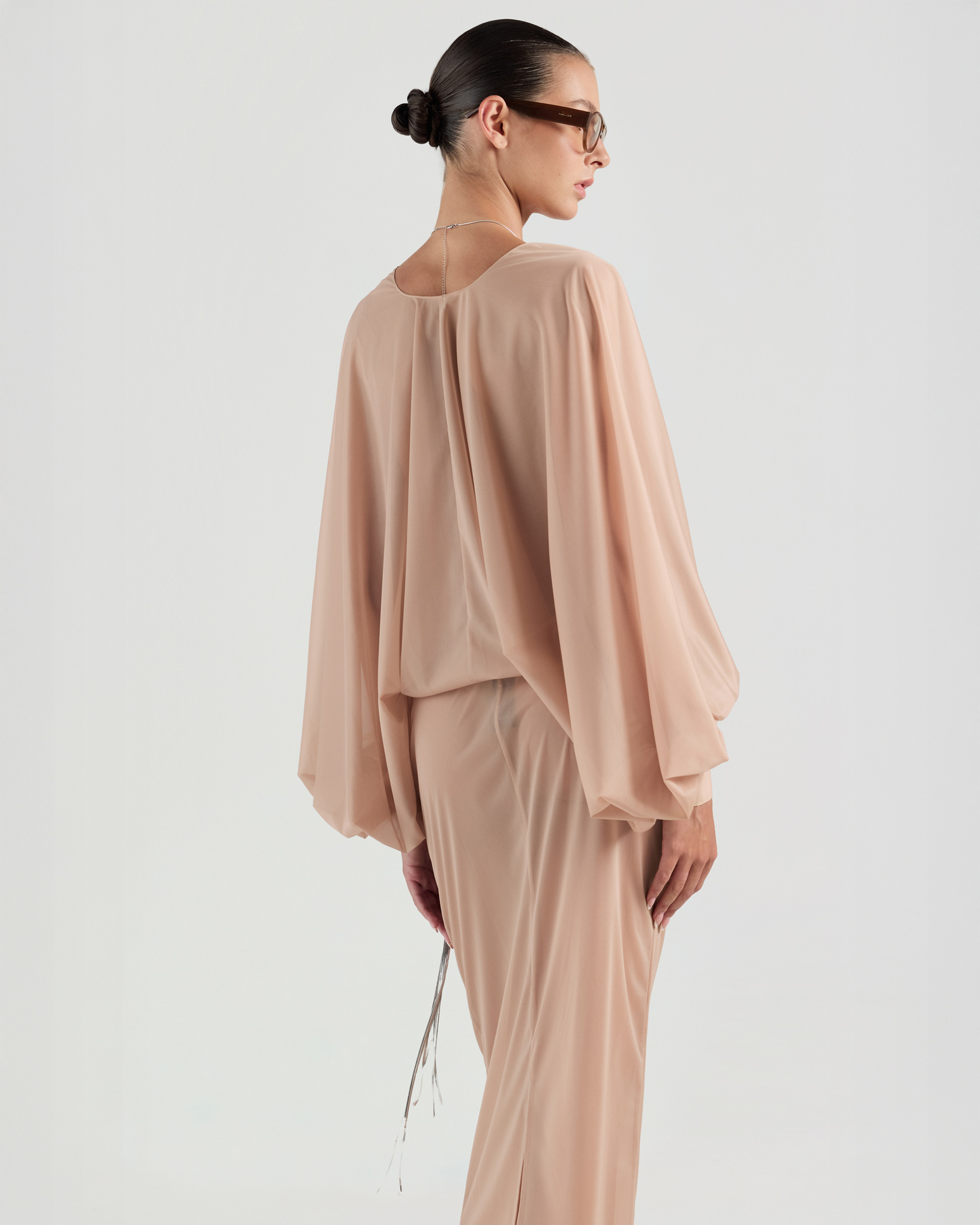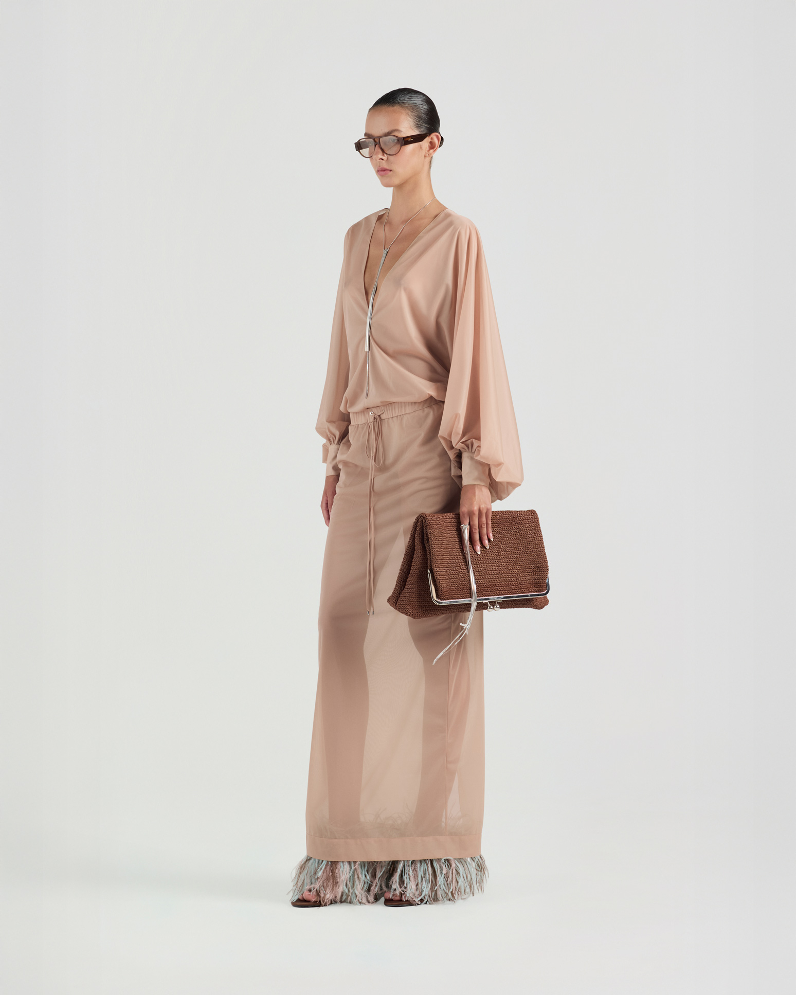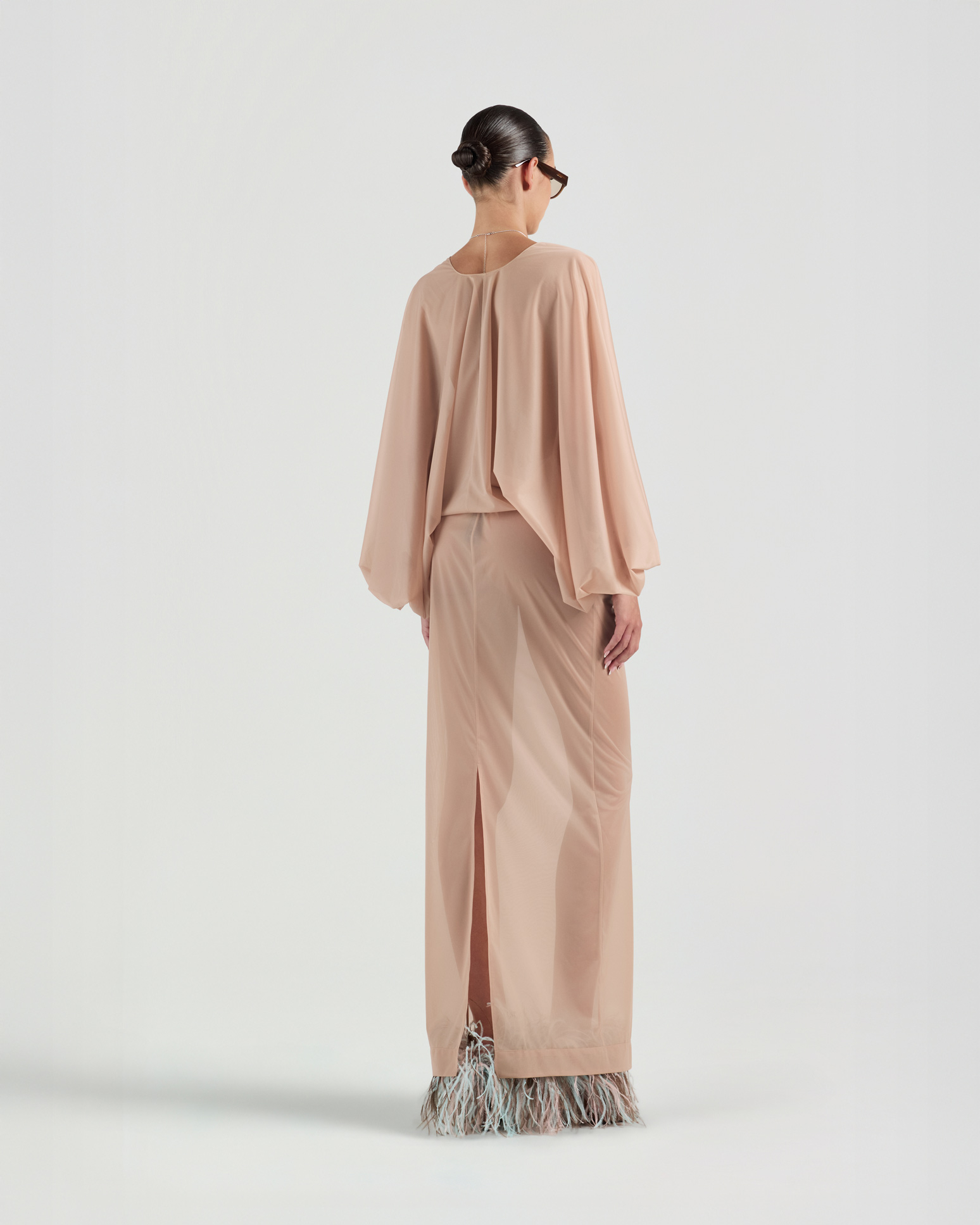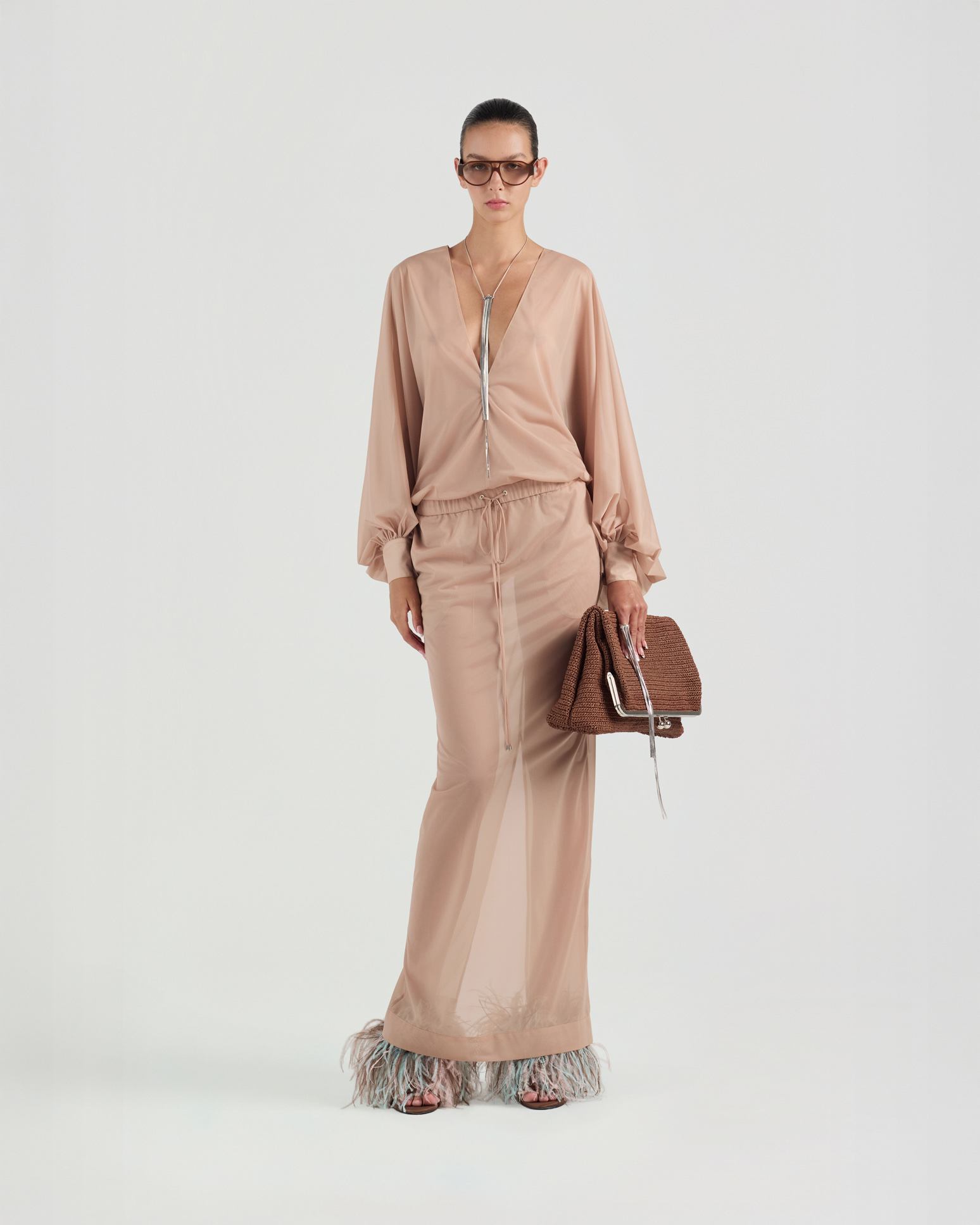 Defined by its sheer fabrication, this long skirt offers a soft, fluid drape with an airy, lightweight feel. The natural flowing silhouette creates a sense of ease and elegance.