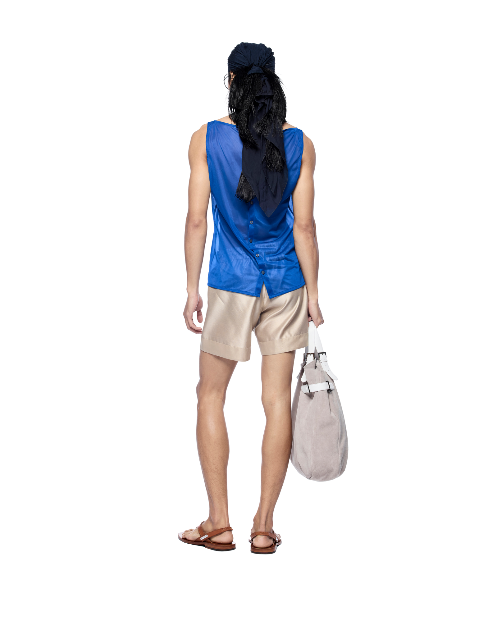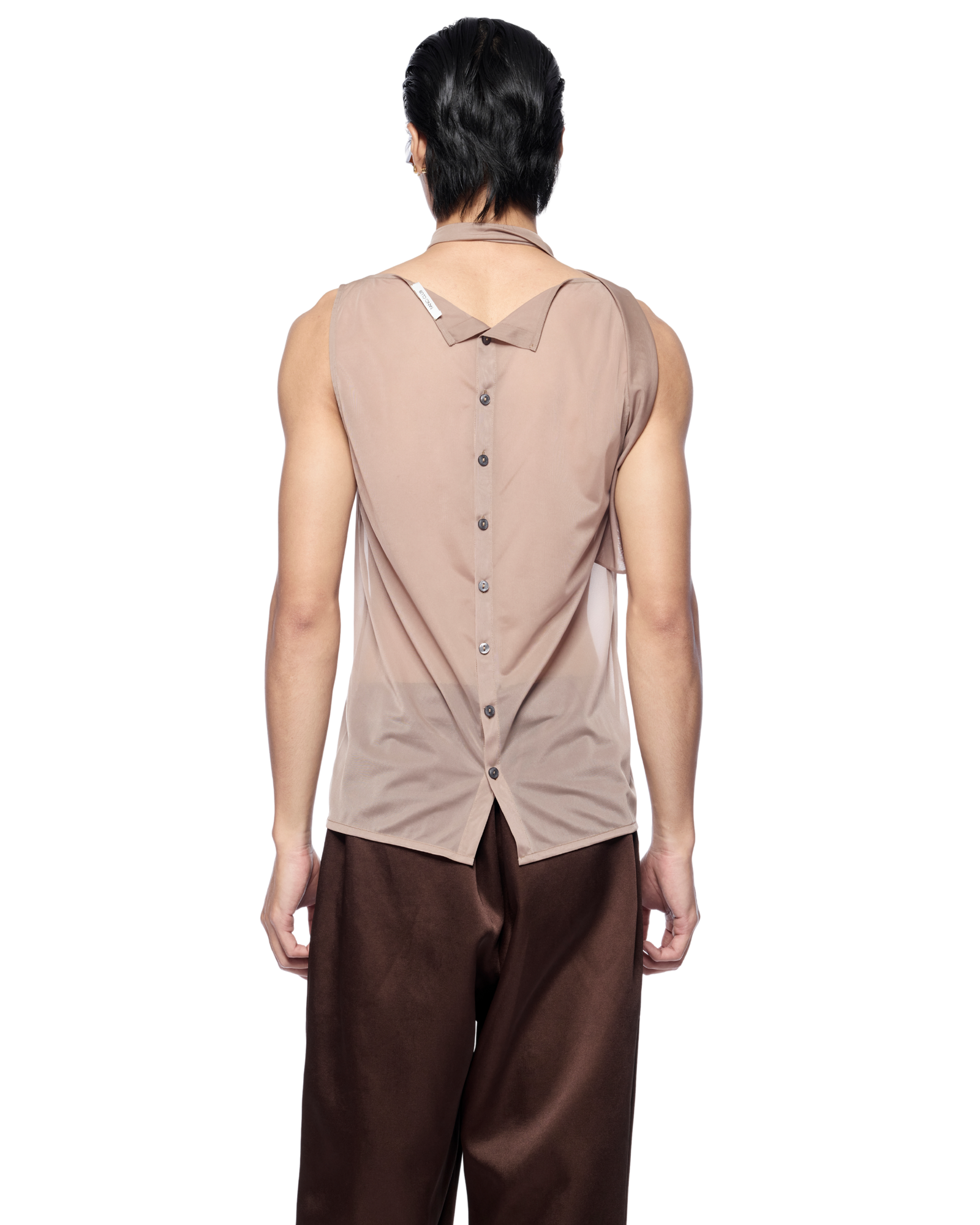 This tank top features a modern plunging neckline with a self-tied detail at collar and back button closure. Pair easily with shorts or wide-leg trousers.