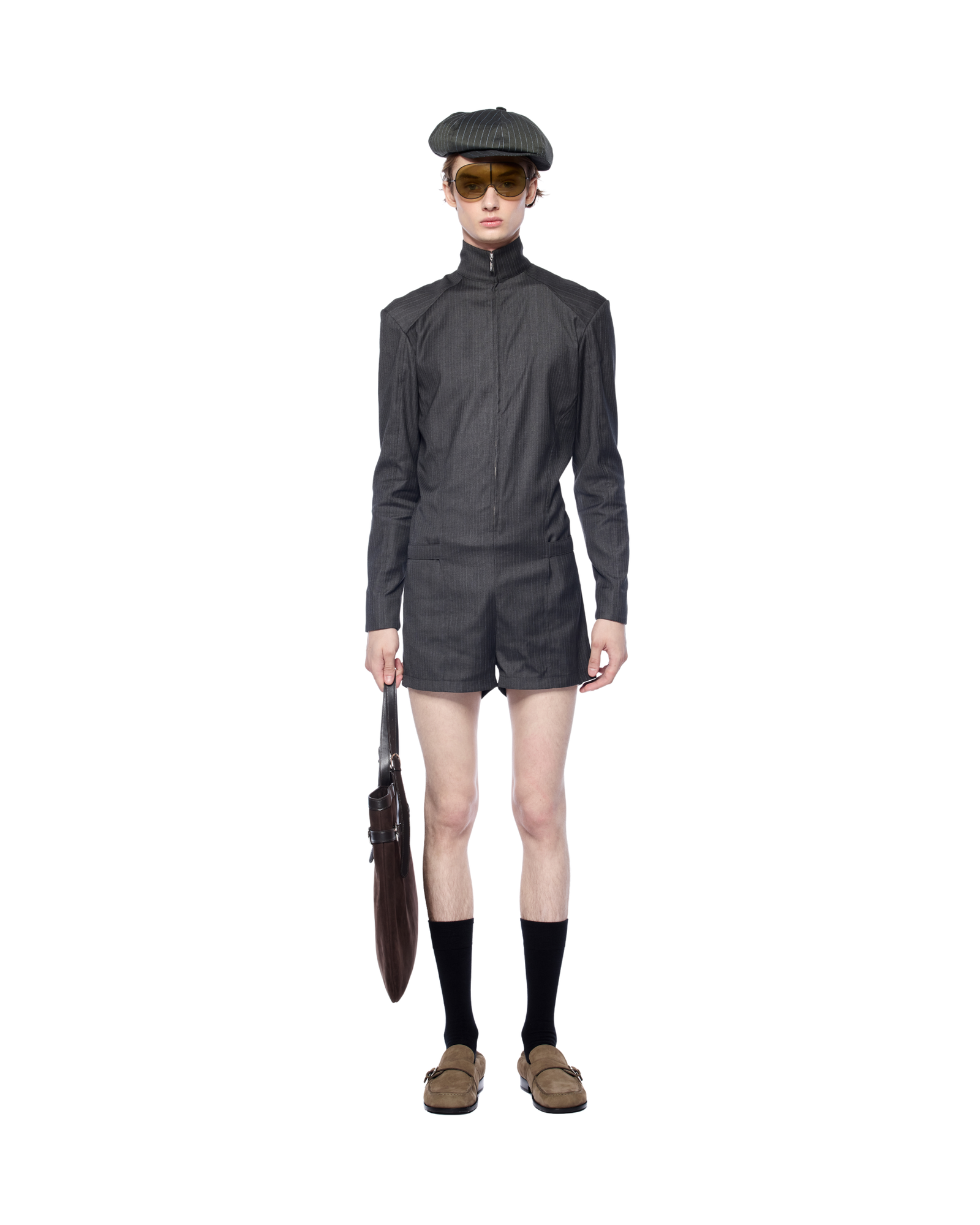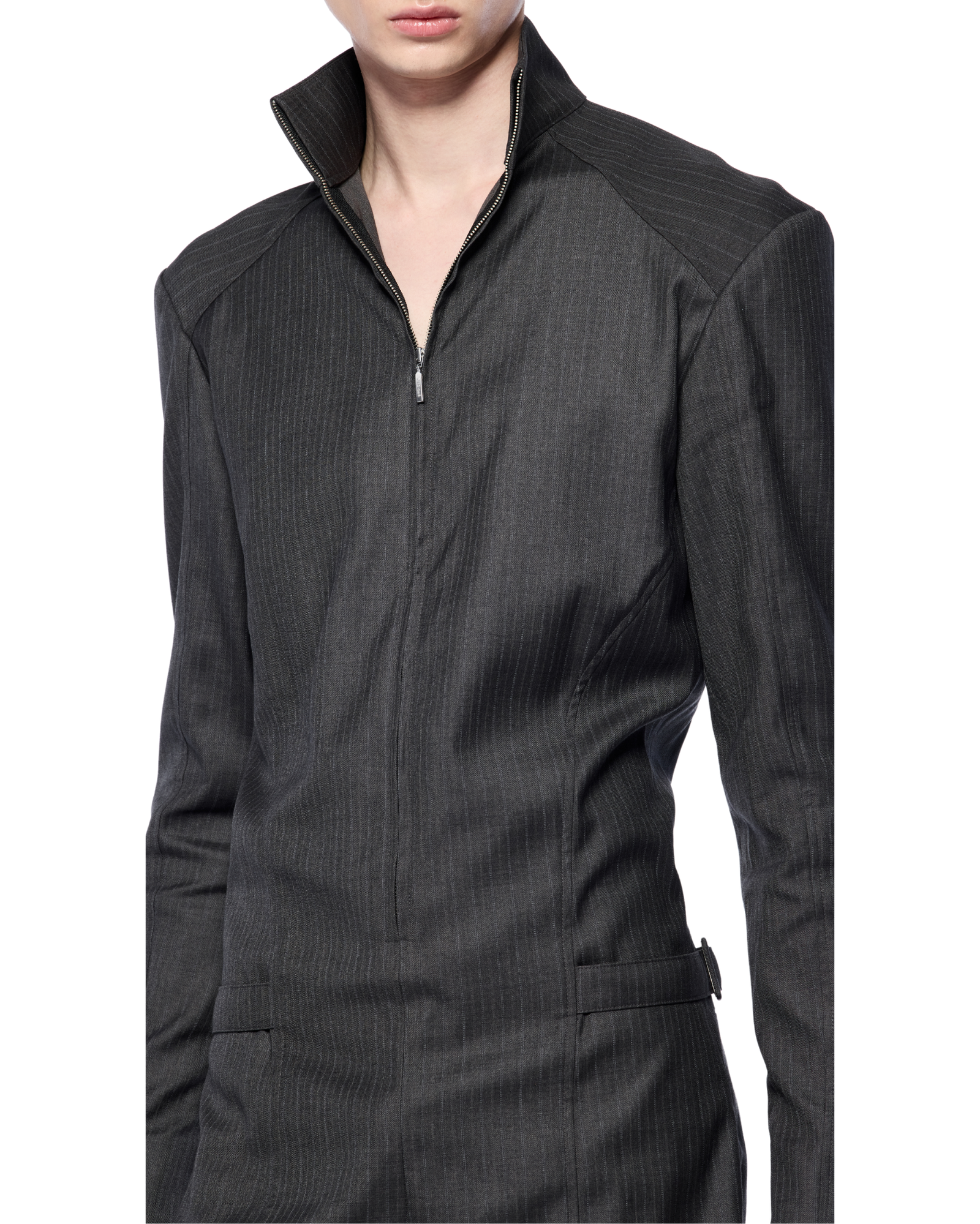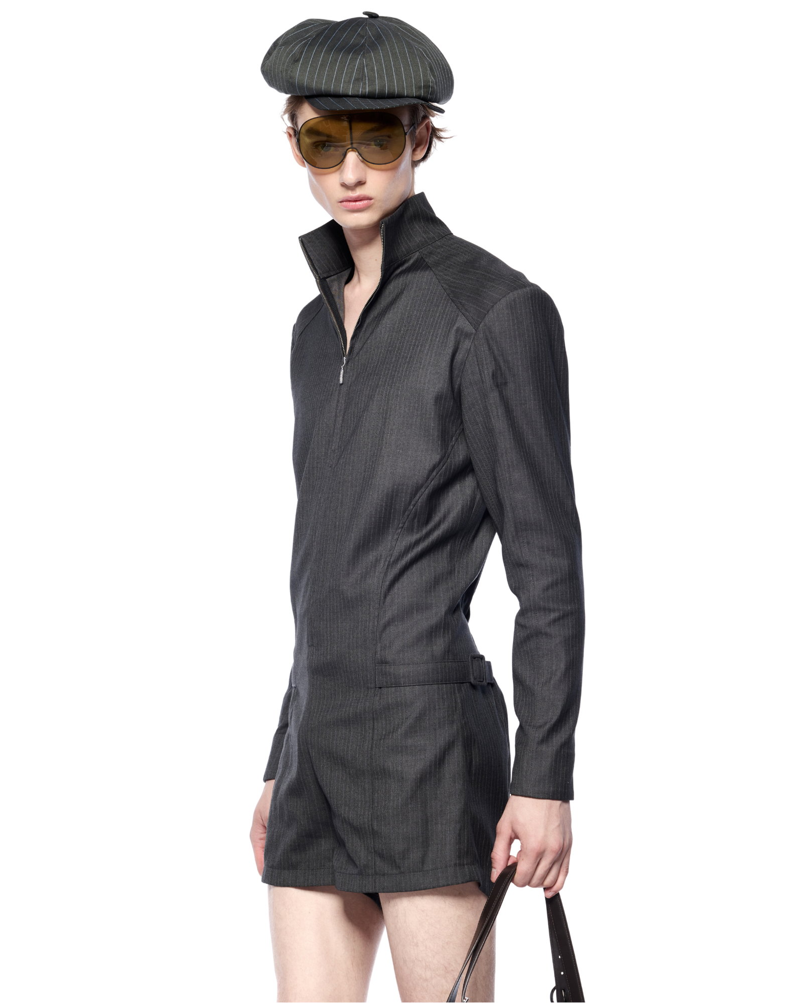 A sculpted short bodysuit with a front zip closure and defining side belts at the waist. Designed in a firm yet airy fabric, it complements statement bags in medium-to-large size