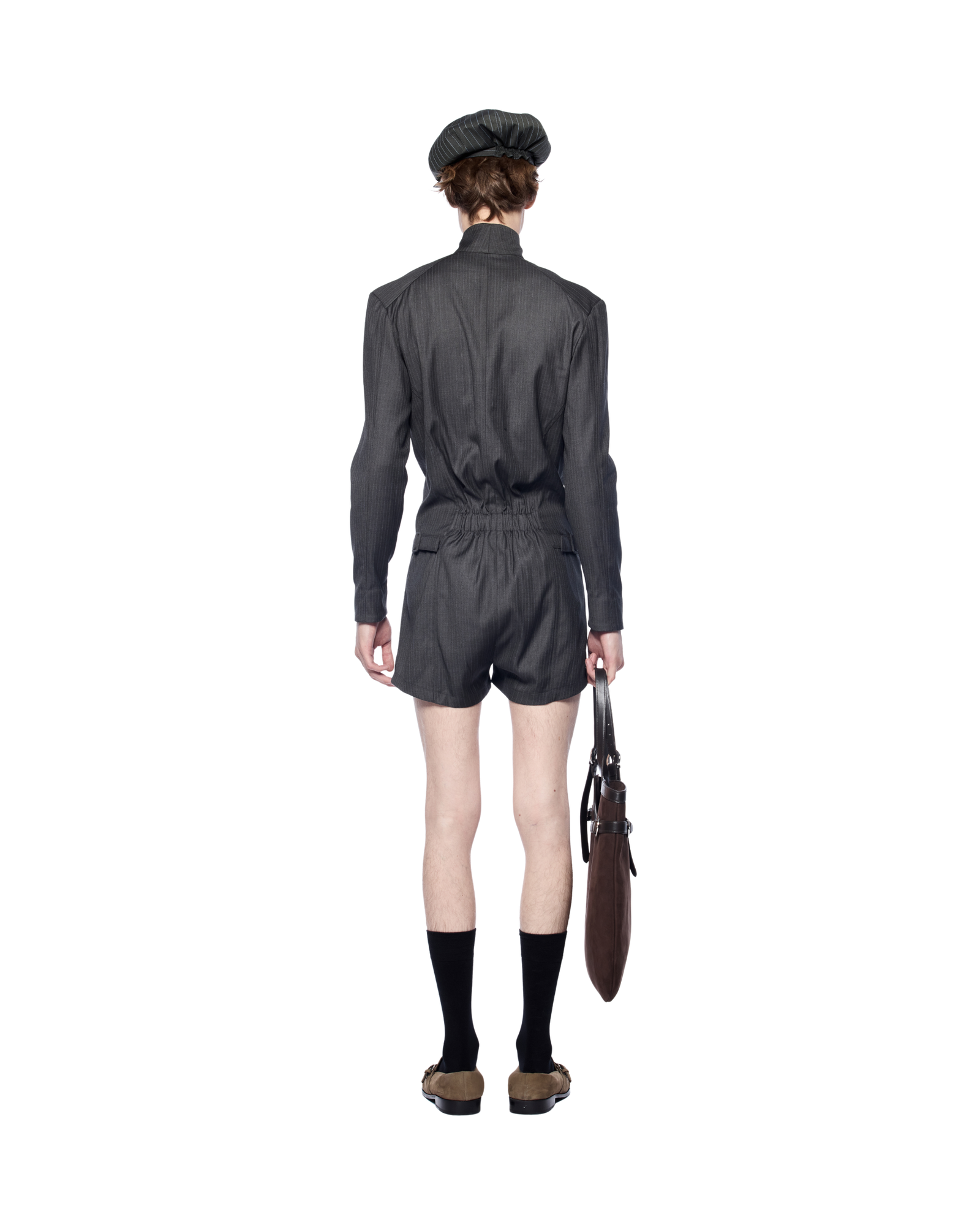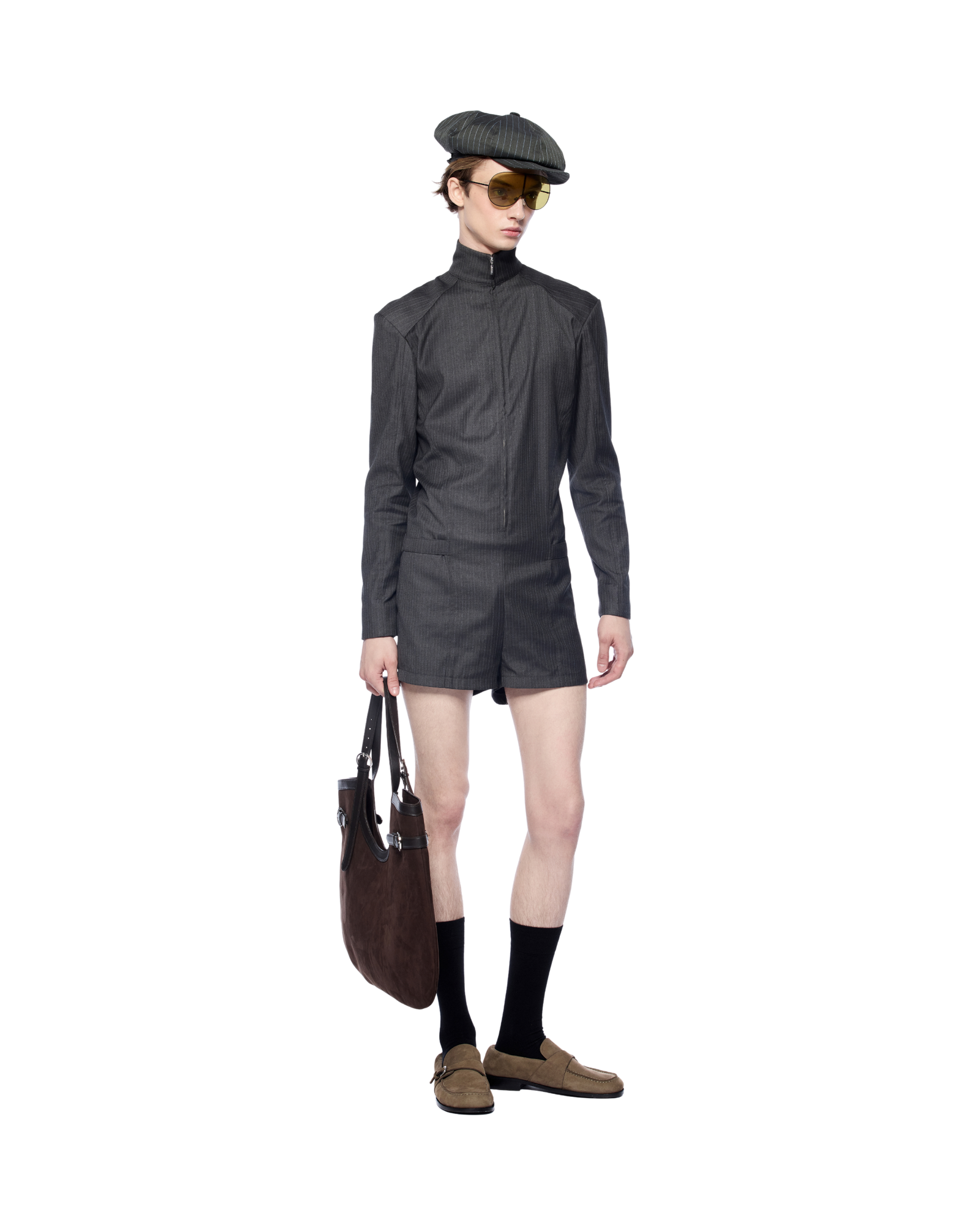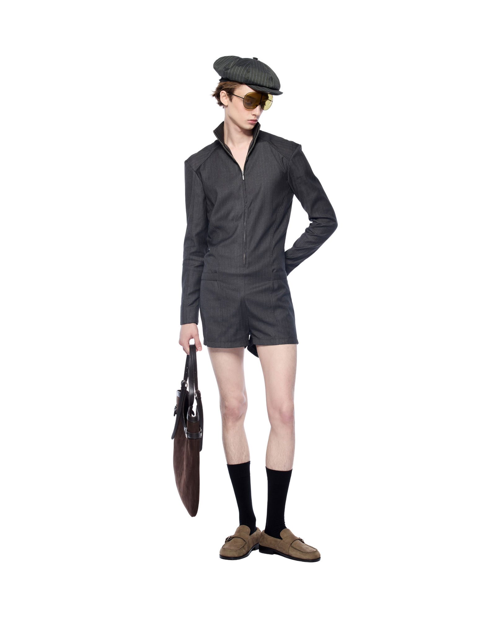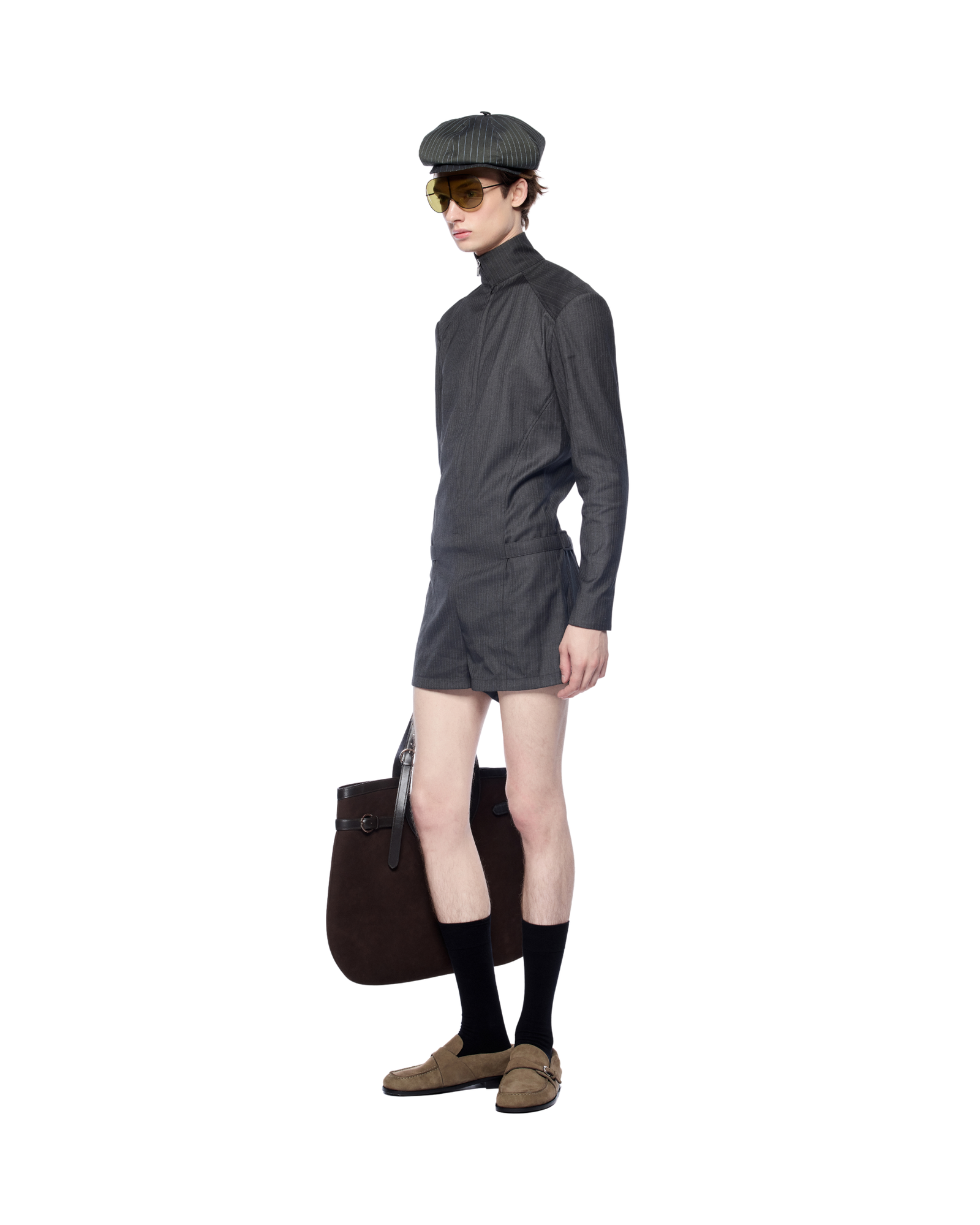 A sculpted short bodysuit with a front zip closure and defining side belts at the waist. Designed in a firm yet airy fabric, it complements statement bags in medium-to-large size