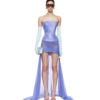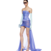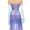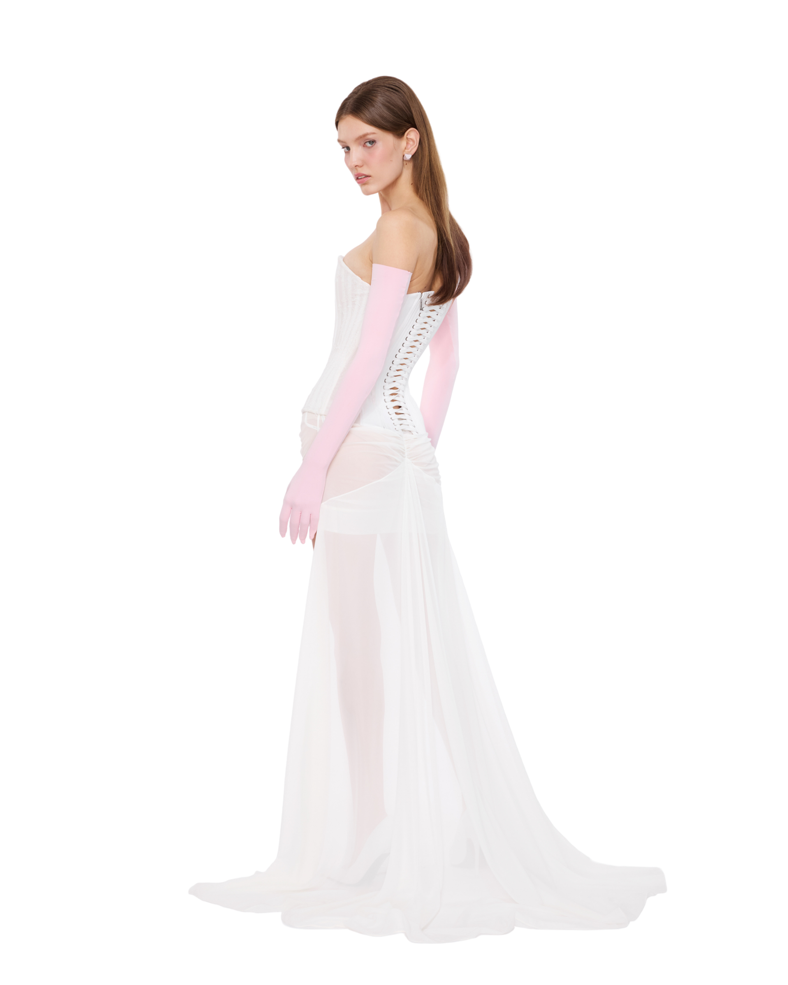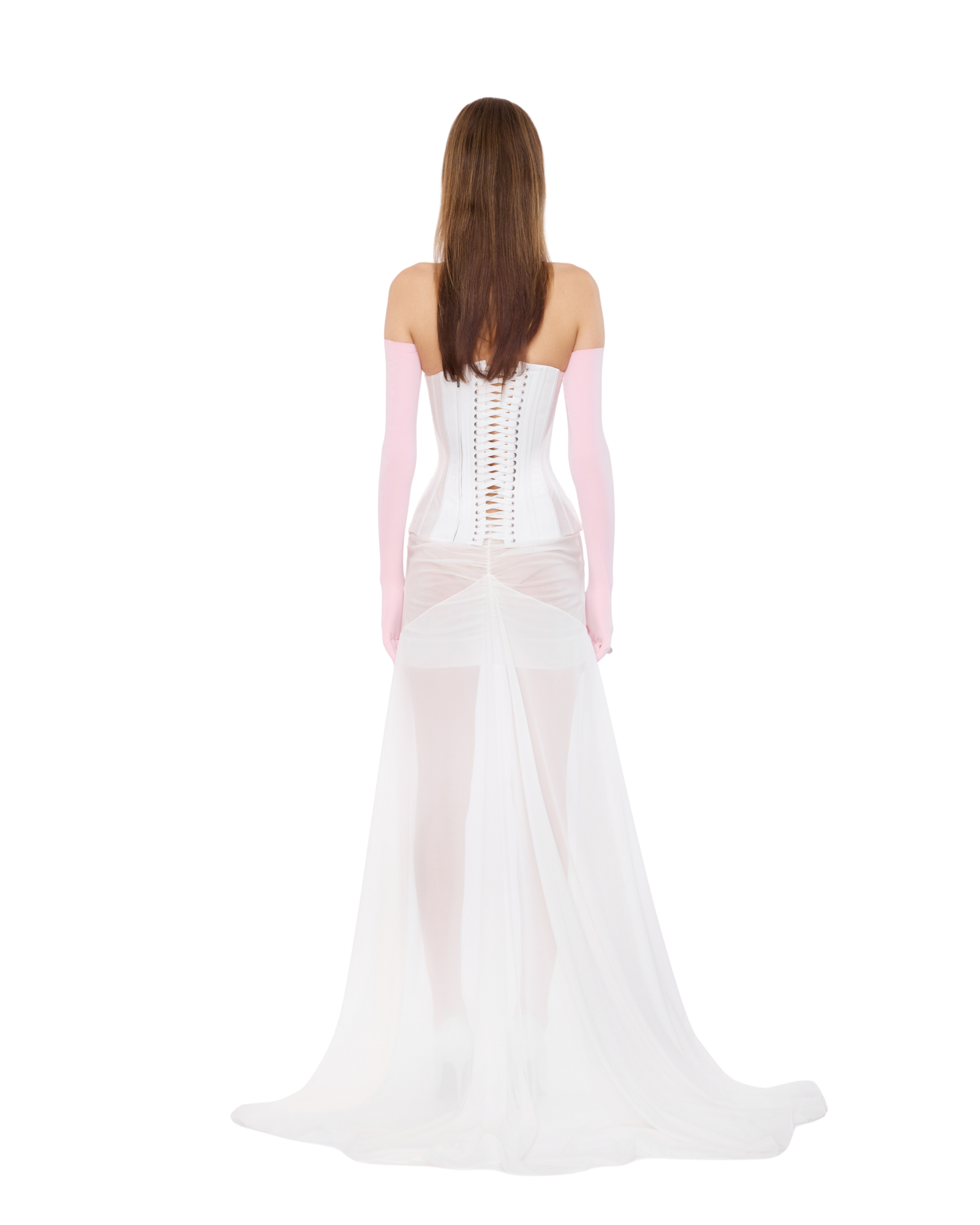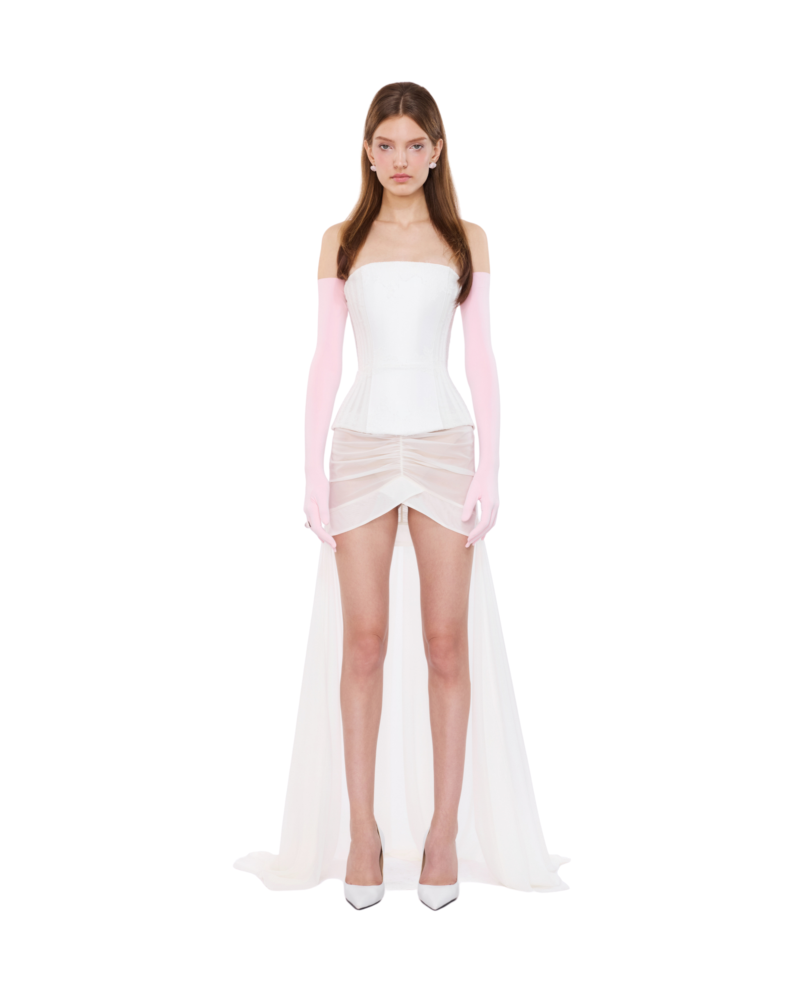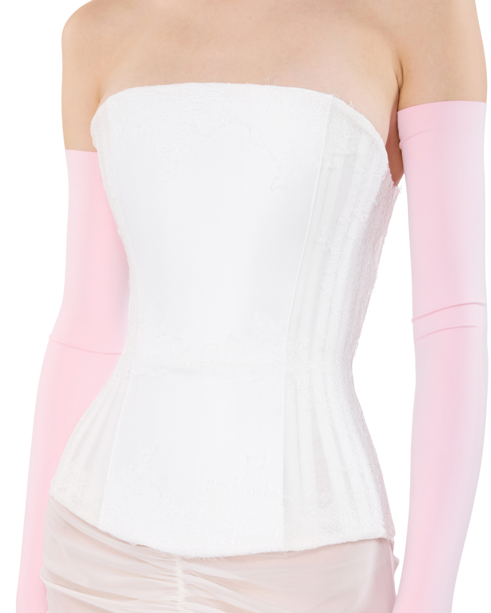 Intricately hand-appliquéd lace cascades across the satin body, bringing a refined yet modern edge. Structured with subtle boning and paneled construction, it cinches the waist while keeping the surface sleek and uninterrupted. Style with tailored leggings, a mini skirt, or a floor-length skirt for versatile allure.