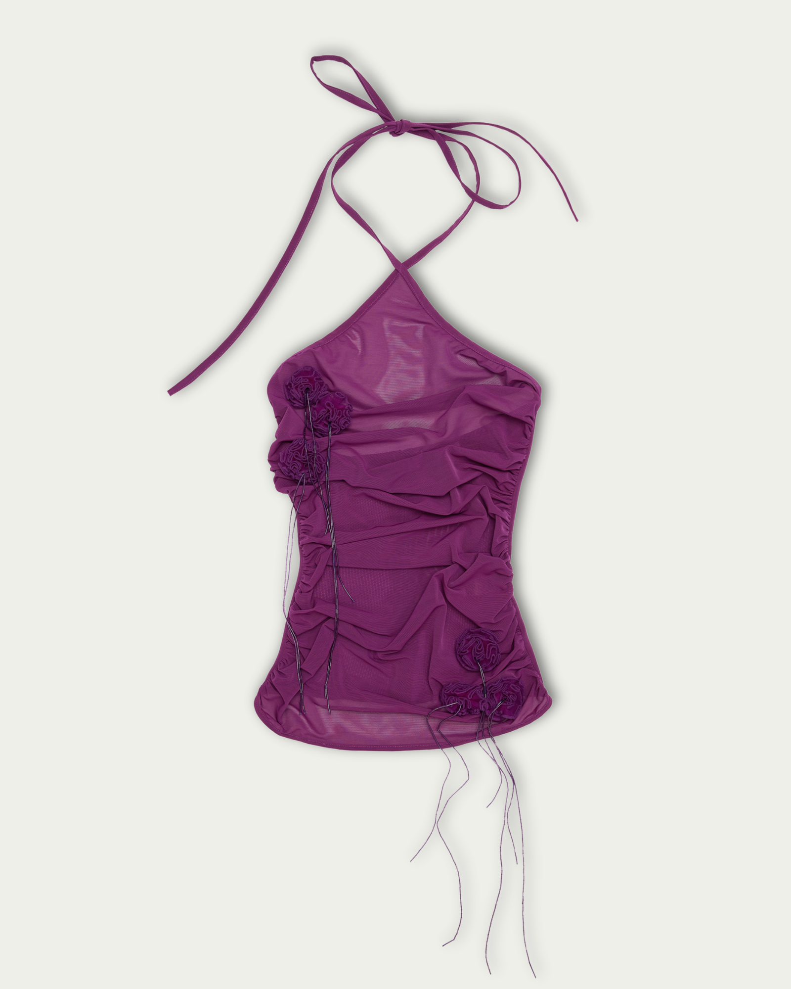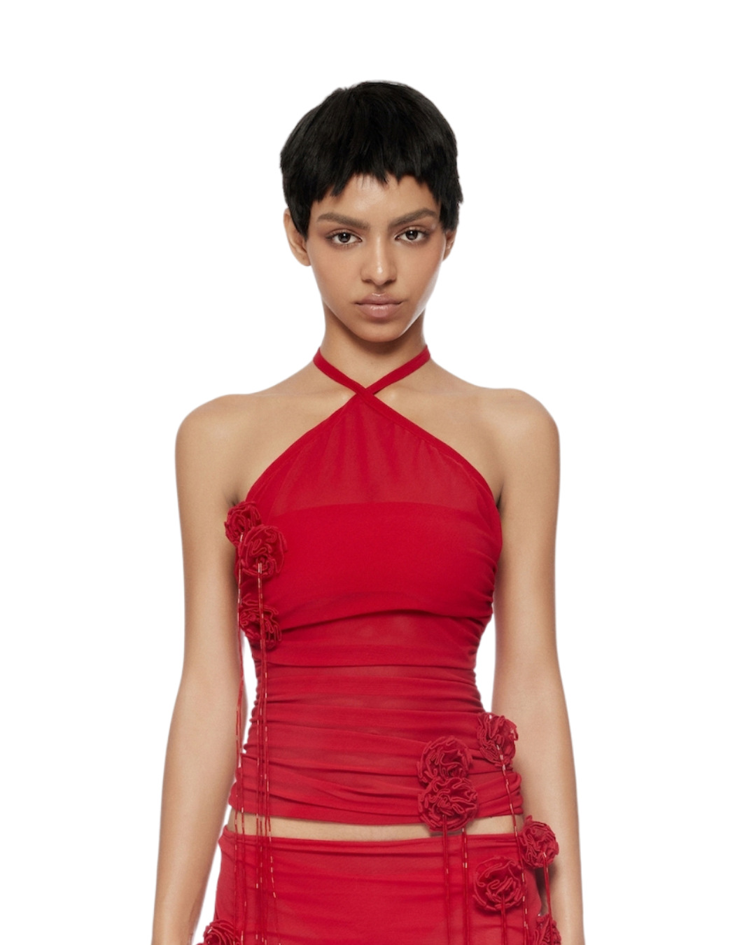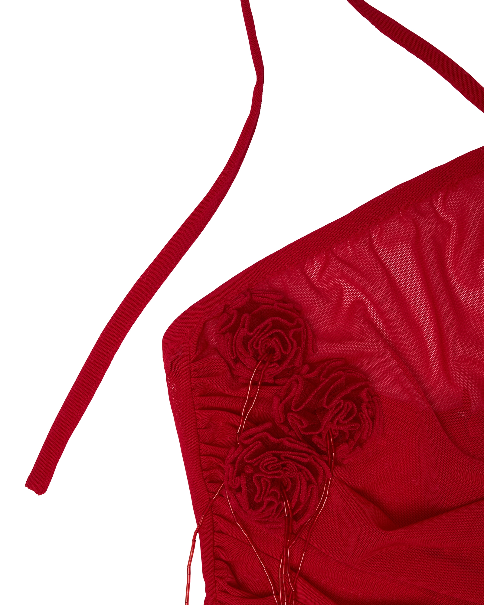 Semi-sheer stretch nylon mesh halter strap top with handmade rosette