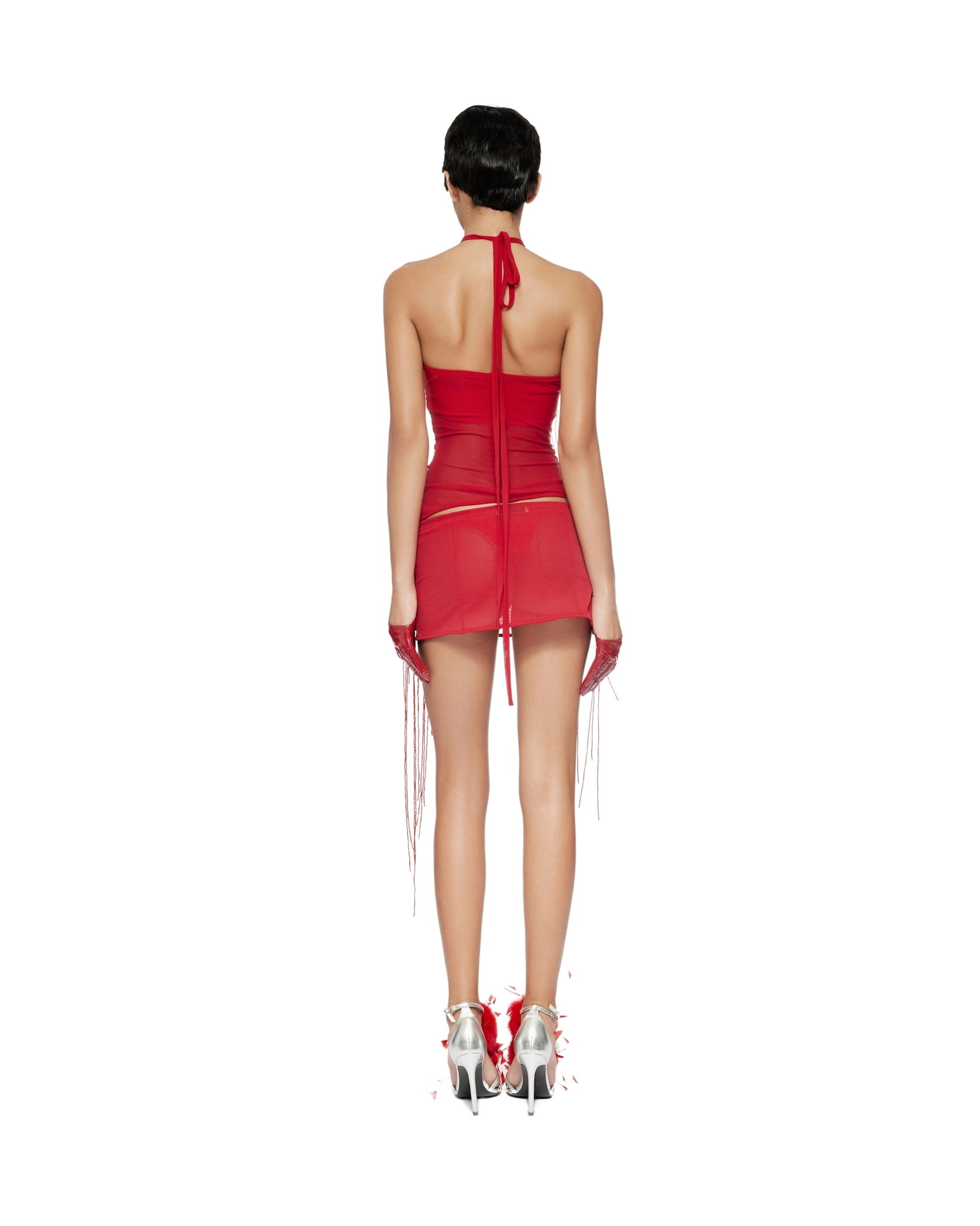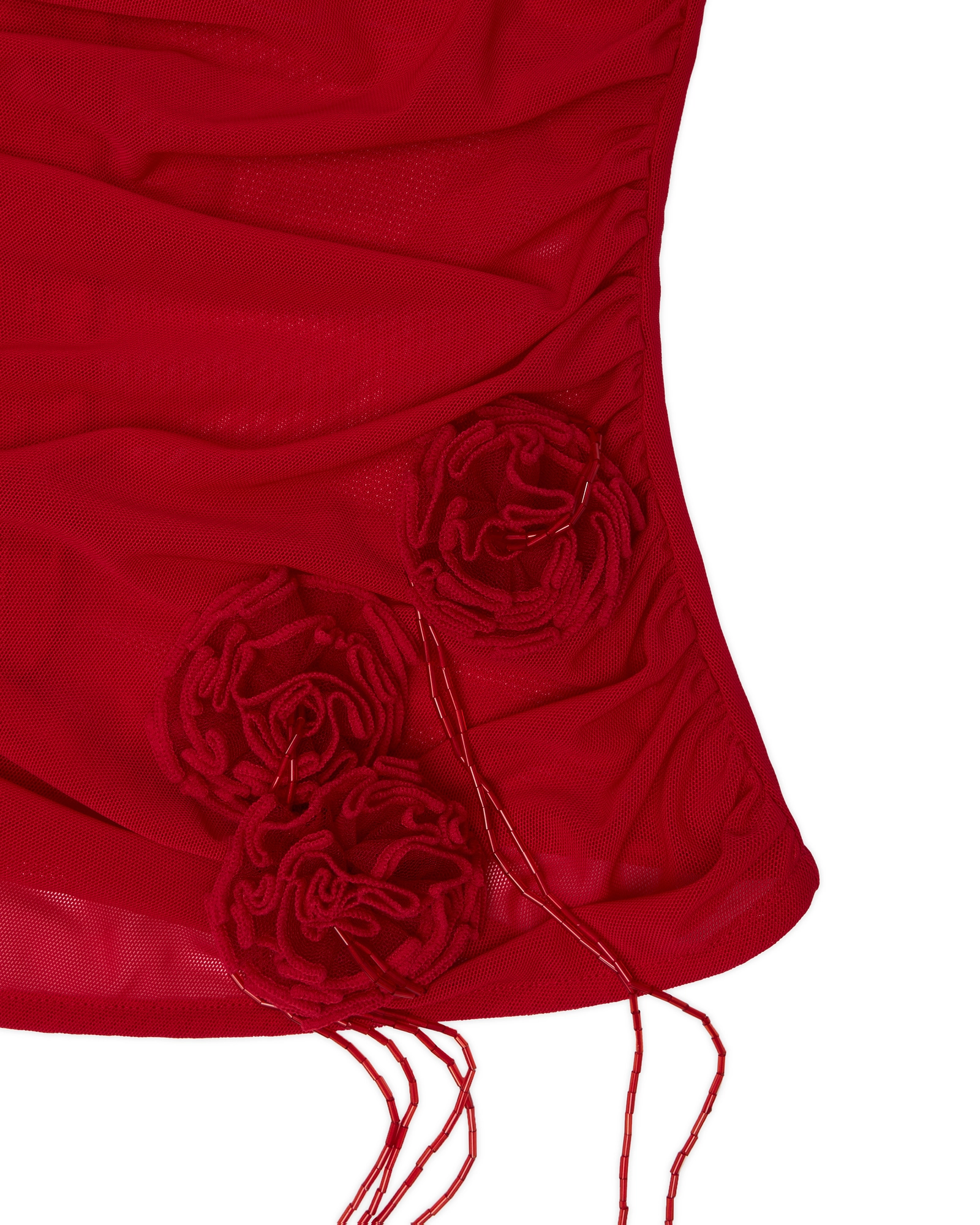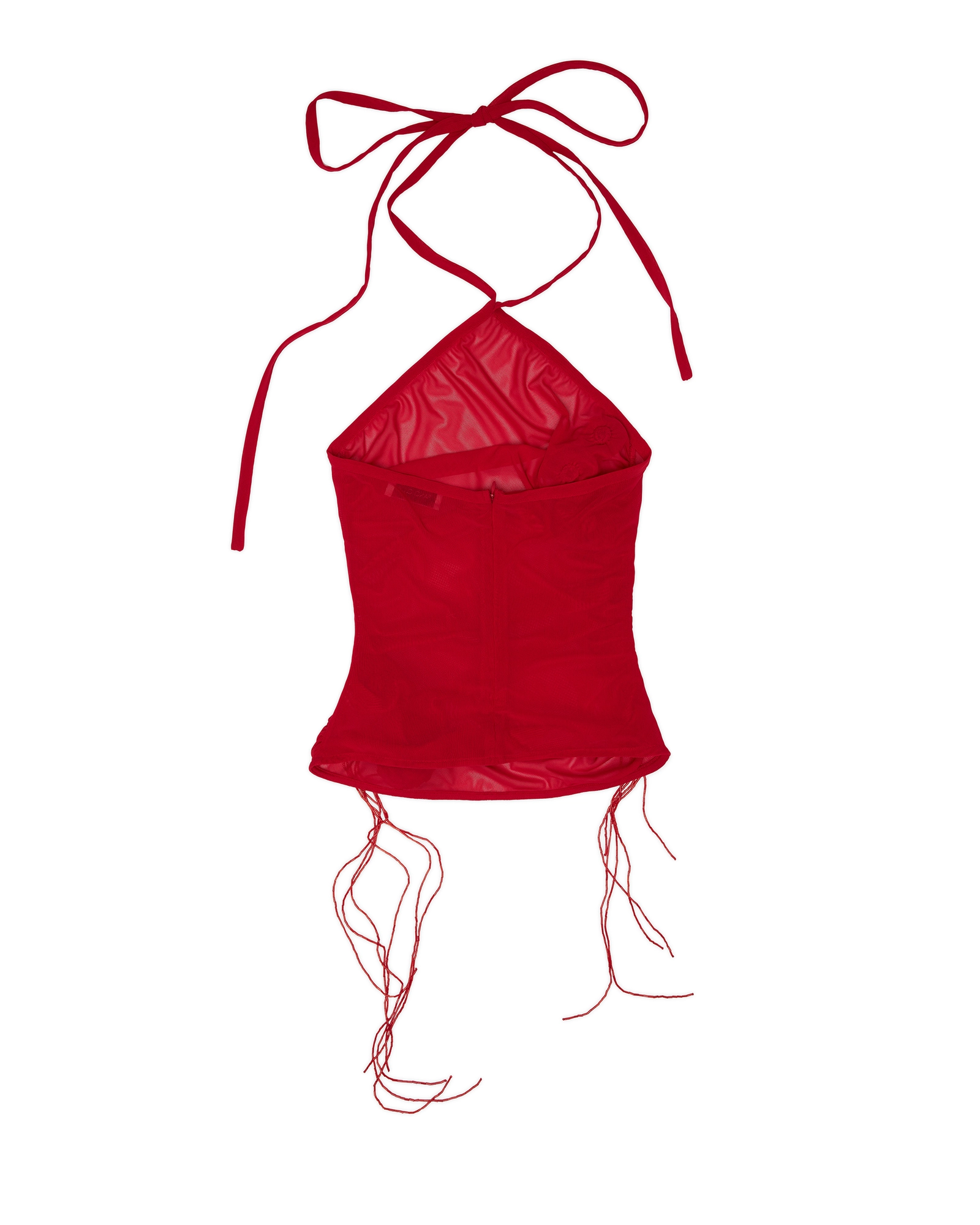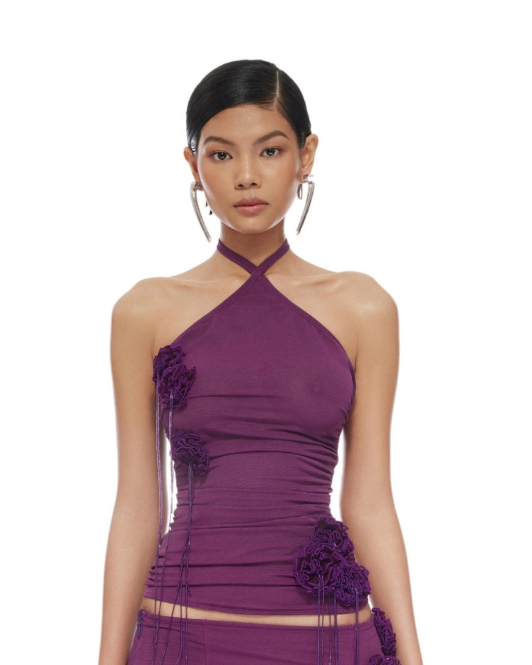 Semi-sheer stretch nylon mesh halter strap top with handmade rosette