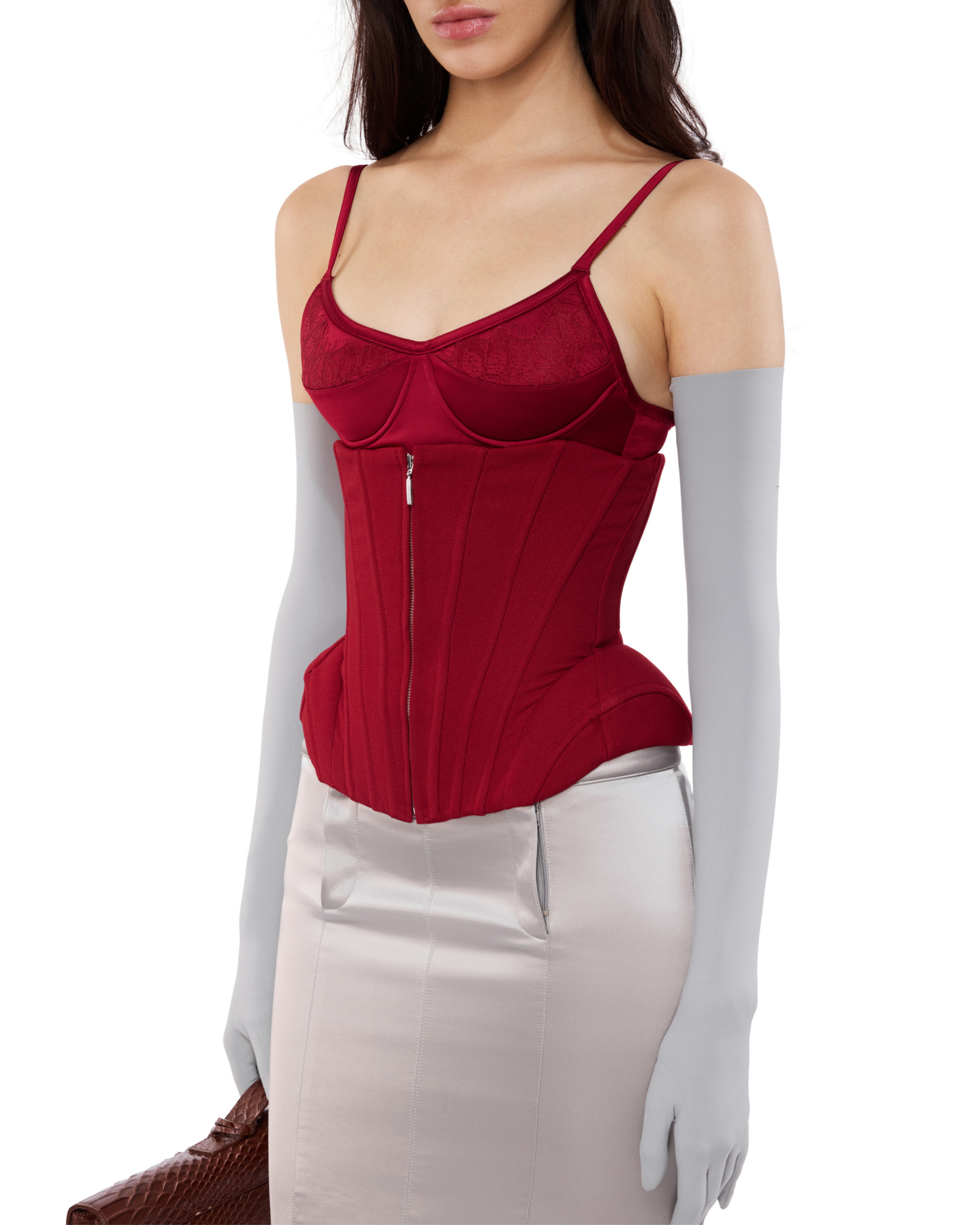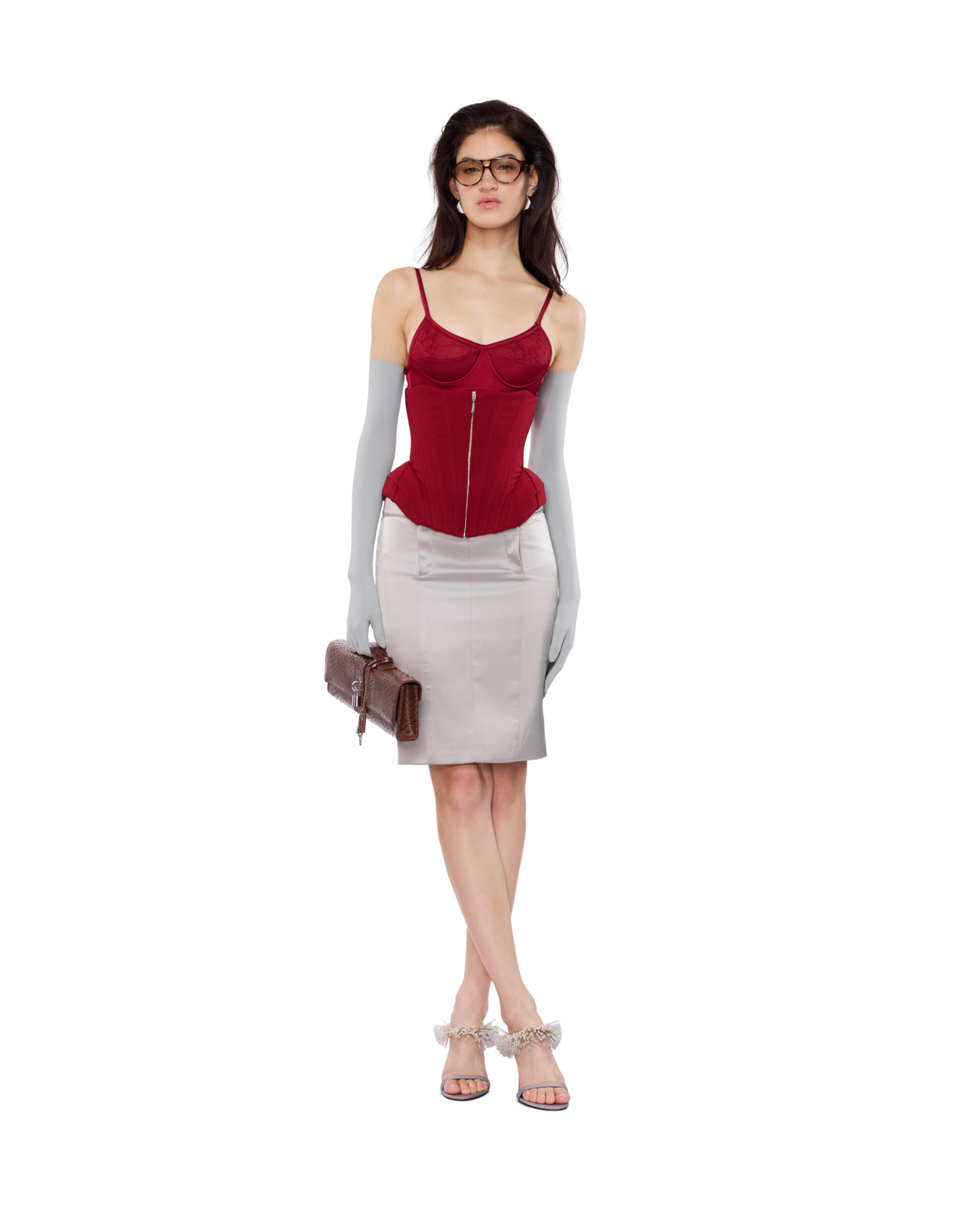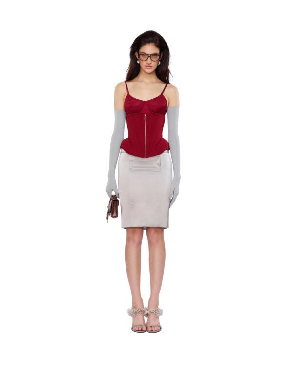 This satin pencil midi skirt with a paneled construction and signature double zip fly, hugging the body with a sleek, knee-length silhouette. It pairs perfectly with a matching or contrasting corset, a tucked-in blouse with a blazer, or long-sleeve knits and puffed chiffon tops for versatile styling.